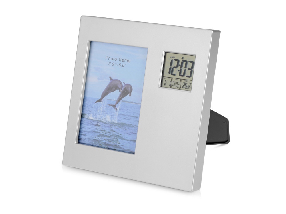 Часы с календарем, будильником, таймером, термометром и рамкой для фотографии 9х13 см. Есть возможность поменять положение цифрового табло с горизонтального на вертикальное, в зависимости от того, как поставлены часы.