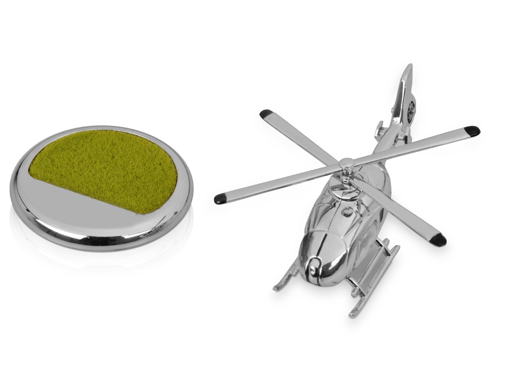 Оригинальные часы в форме вертолета на посадочной площадке. Площадка стилизована под зеленый газон. Корпус вертолета и подставка выполнены из полированного металла. Возможно нанесение оригинальной гравировки: текста поздравления, имени владельца или логотипа компании.