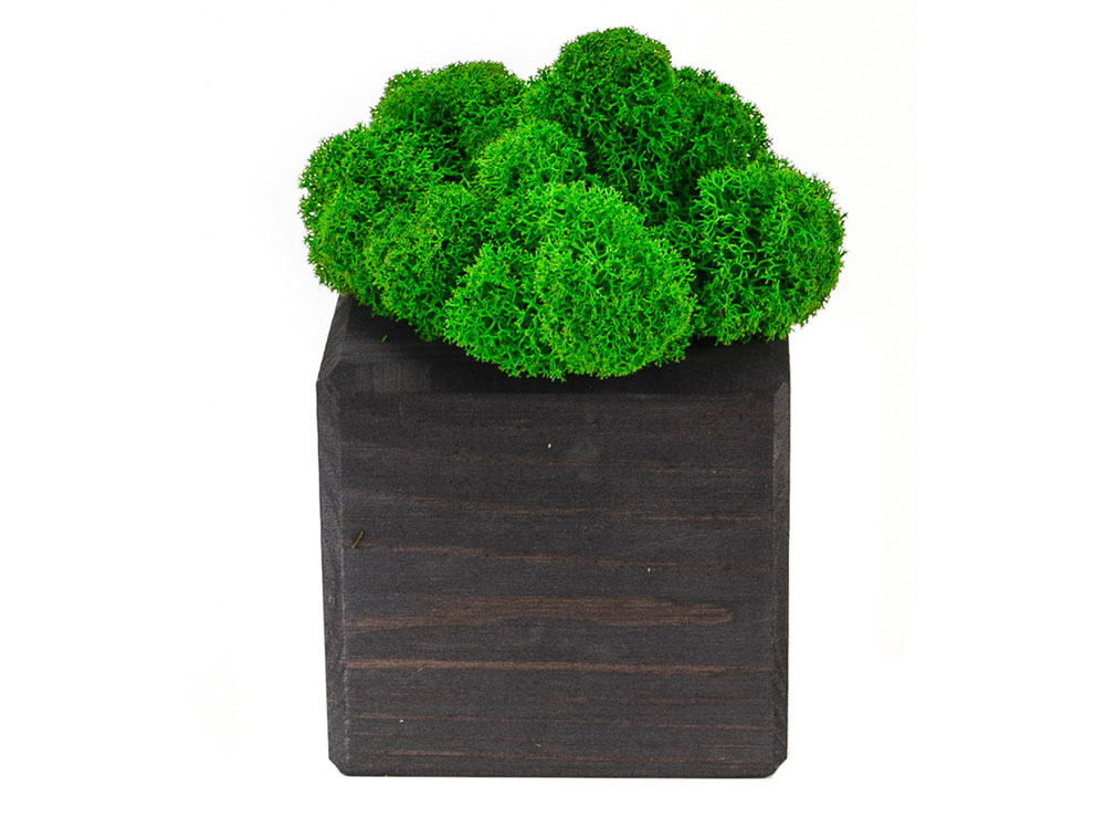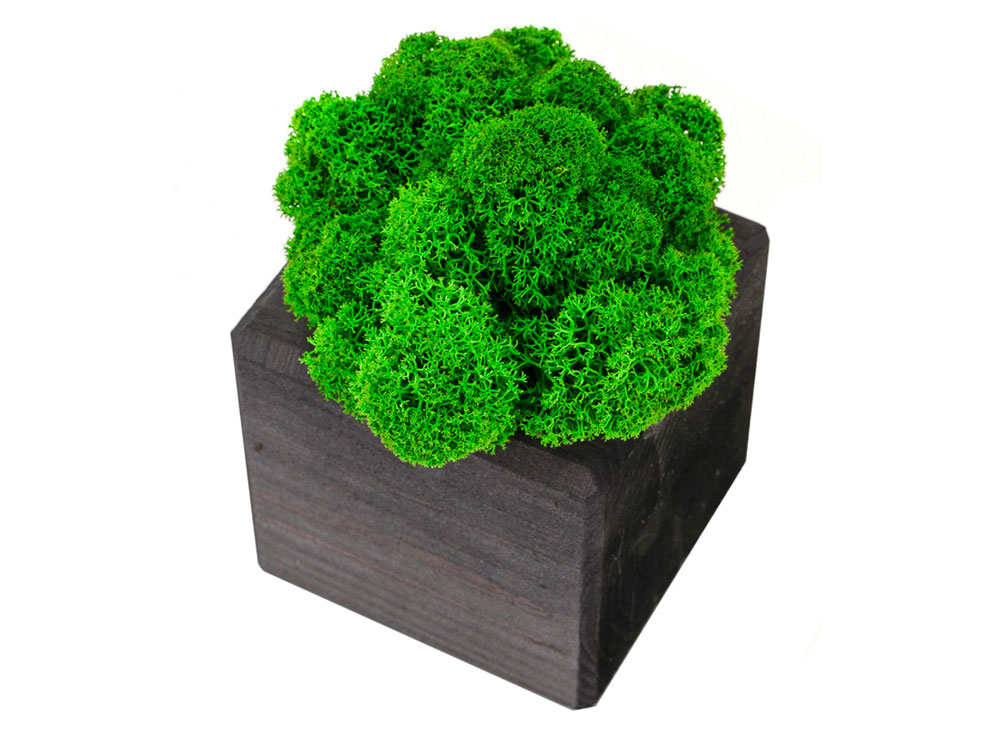 Изделие состоит из стабилизированного мха ягеля, деревянного куба и деревянного упаковочного каркаса. Отталкивает пыль и придает интерьеру индивидуальность. Размер изделия 8х8х13 см.