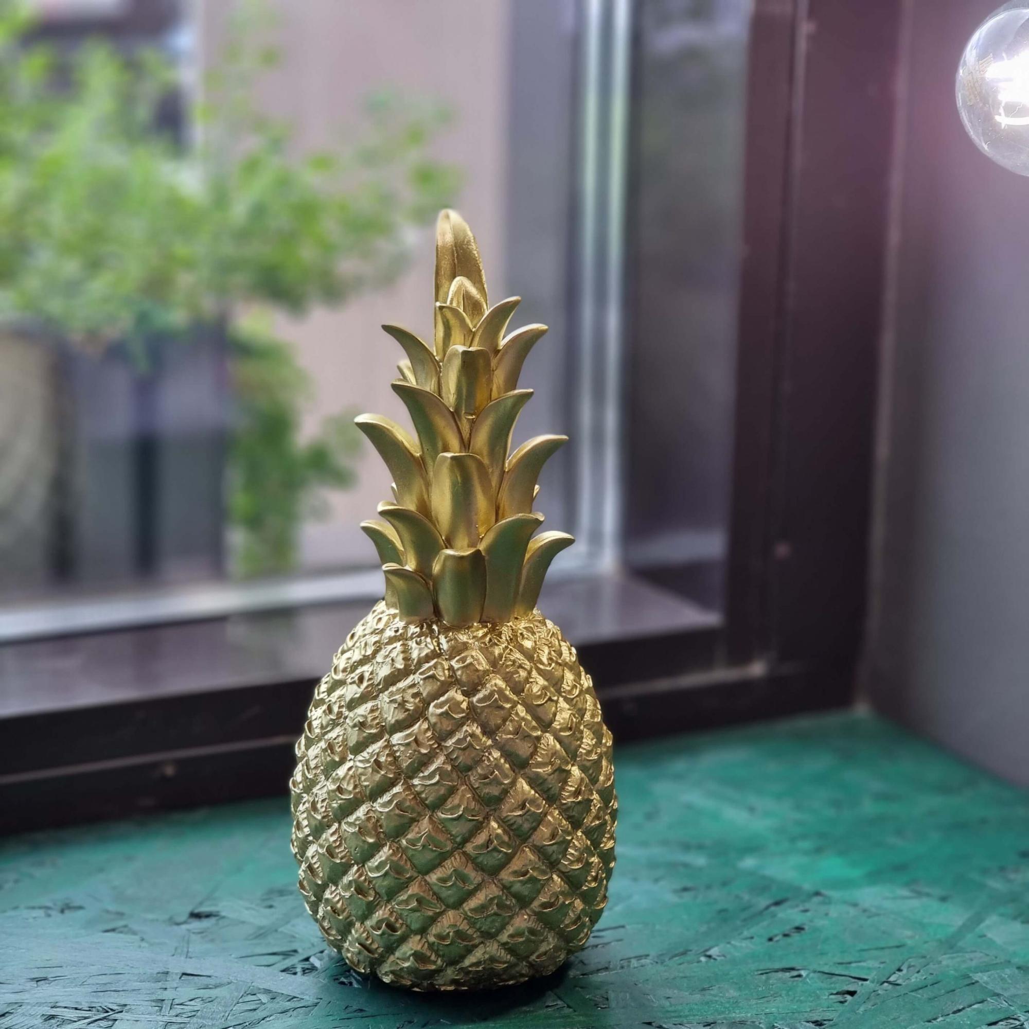 Золотой ананас - стильная вещица для украшения современного интерьера. Статуэтка сделана из современного полимерного материала, из которого производят прочные и долговечные изделия домашнего обихода. Стильная и оригинальная композиция "Золотой Ананас" станет прекрасным декоративным украшением для вашего интерьера! Этот простой предмет способен преобразить интерьер, создать уют и погрузить в особую атмосферу. Композиция прекрасно подойдет для декора любого интерьера, особенно в стиле модерн. Ее можно поставить в любом месте, где она будет удачно смотреться и радовать глаз. Кроме того, это отличный вариант подарка для ваших близких и друзей.