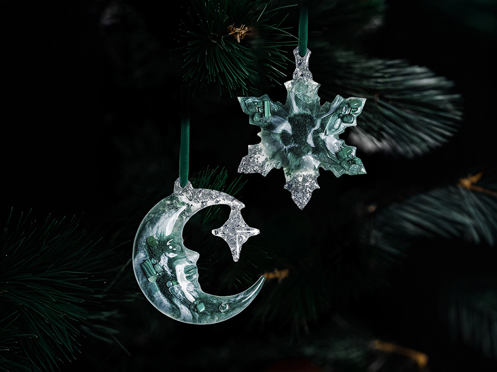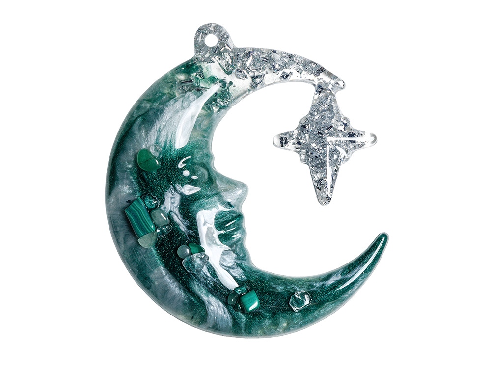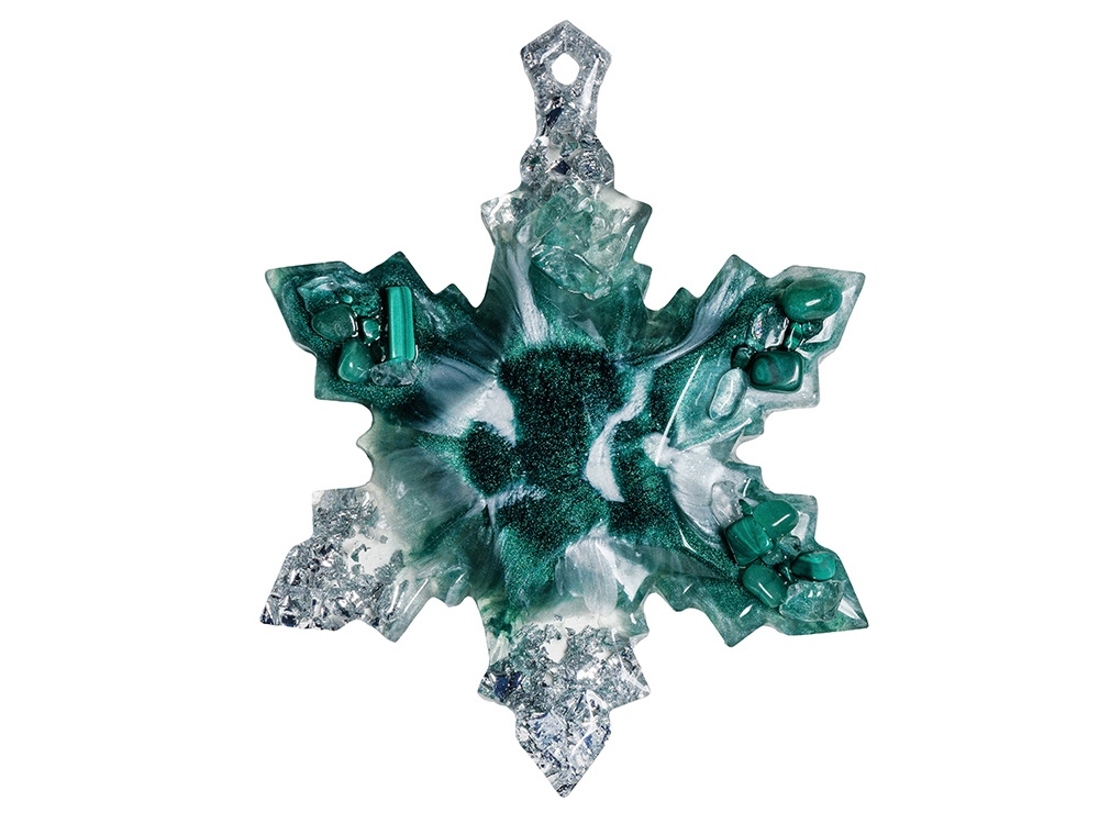 Набор из 2-х елочных игрушек: в форме месяца и снежинки. Игрушки выполнены из ювелирной эпоксидной смолы и украшены галтовкой из натуральных минералов.