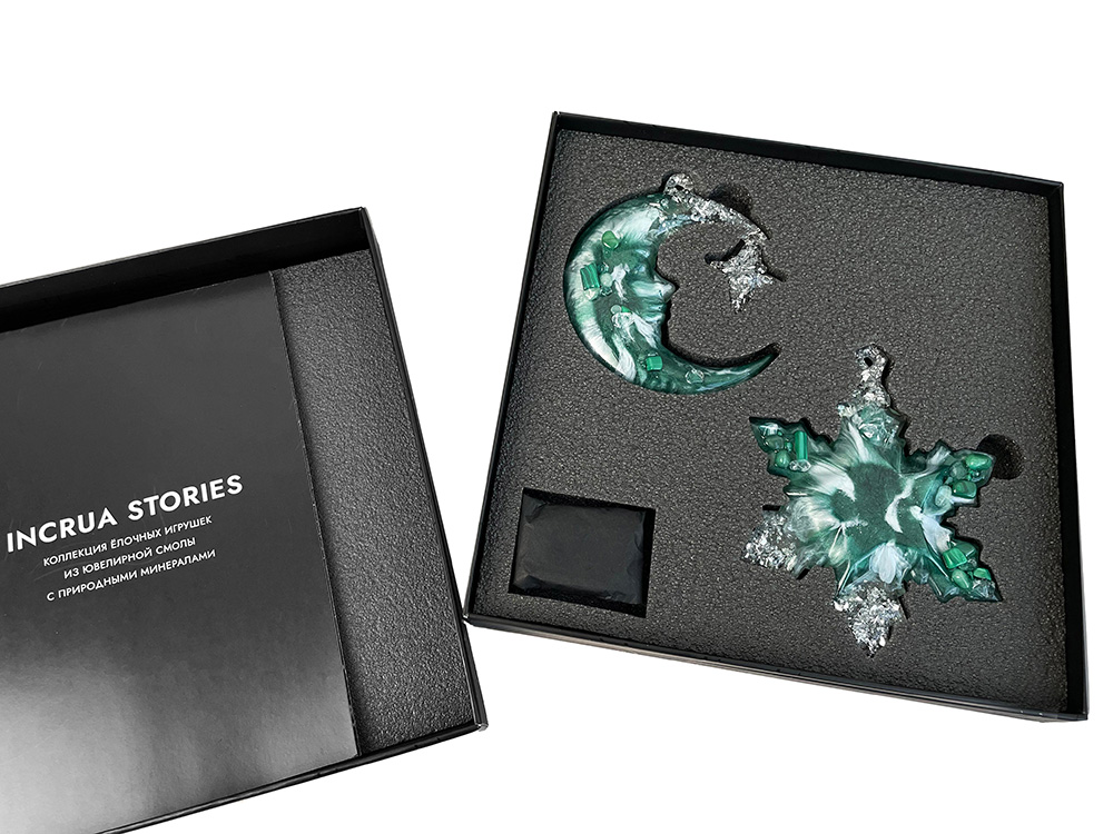 Игрушки бережно упакованы в стильную коробку из плотного премиального картона с индивидуальным ложементом, который надёжно фиксирует игрушку. Такой презент не требует дополнительной упаковки и готов порадовать своего обладателя. Для вашего удобства к каждой игрушке прилагается элегантная ленточка, с помощью которой вы легко сможете подвесить их на ёлку.