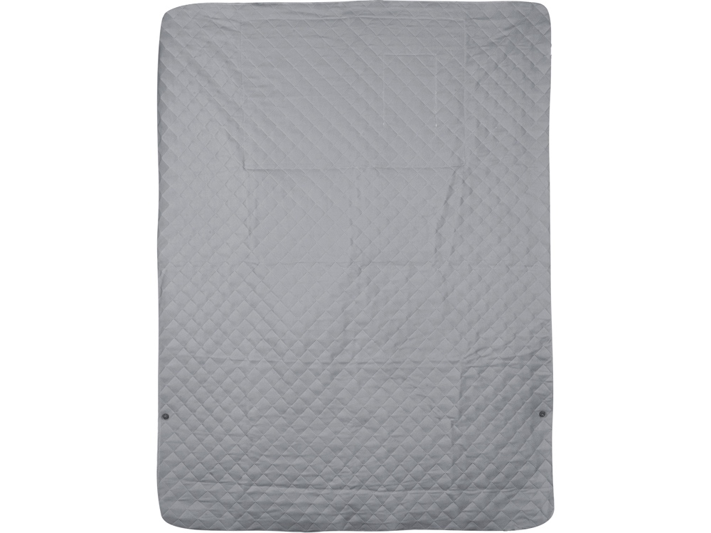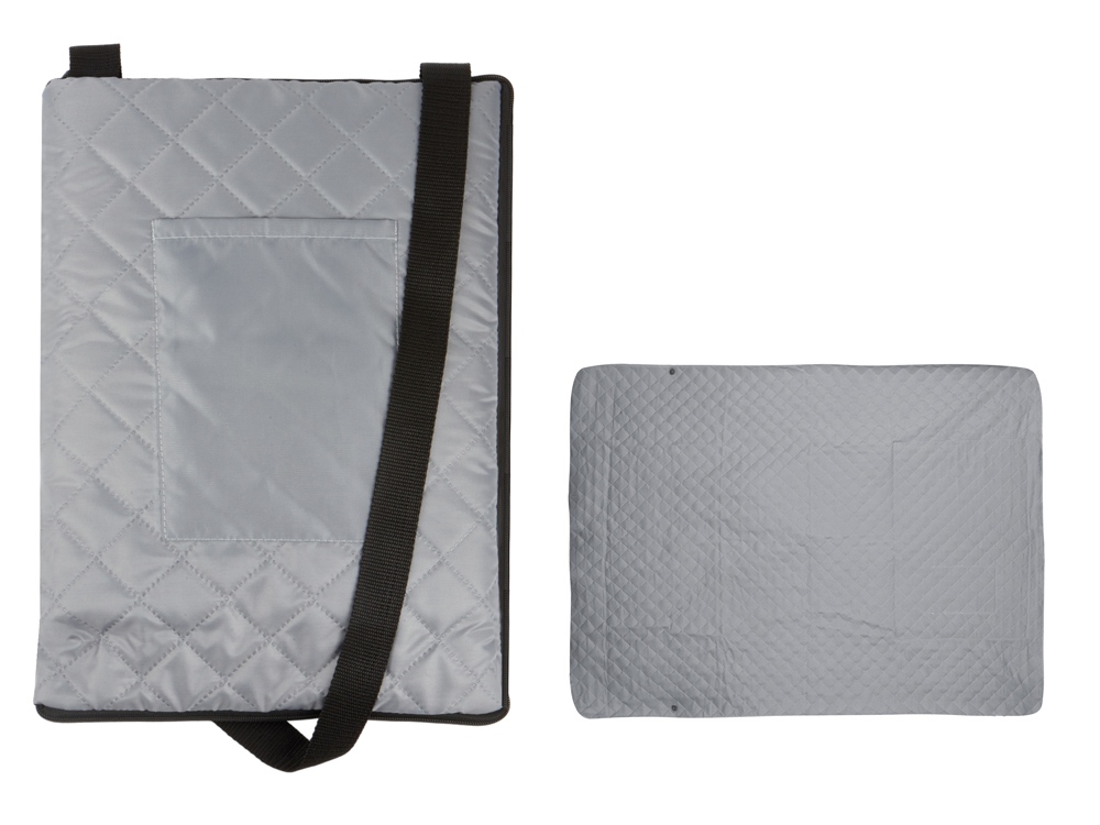 Двухсторонний плед с водоотталкивающим покрытием с одной стороны и мягким флисом с другой. Складывается в сумку на плечо и фиксируется с помощью молнии. В собранном виде имеет регулируемый по длине ремень для переноски и наружный карман для мелочей.