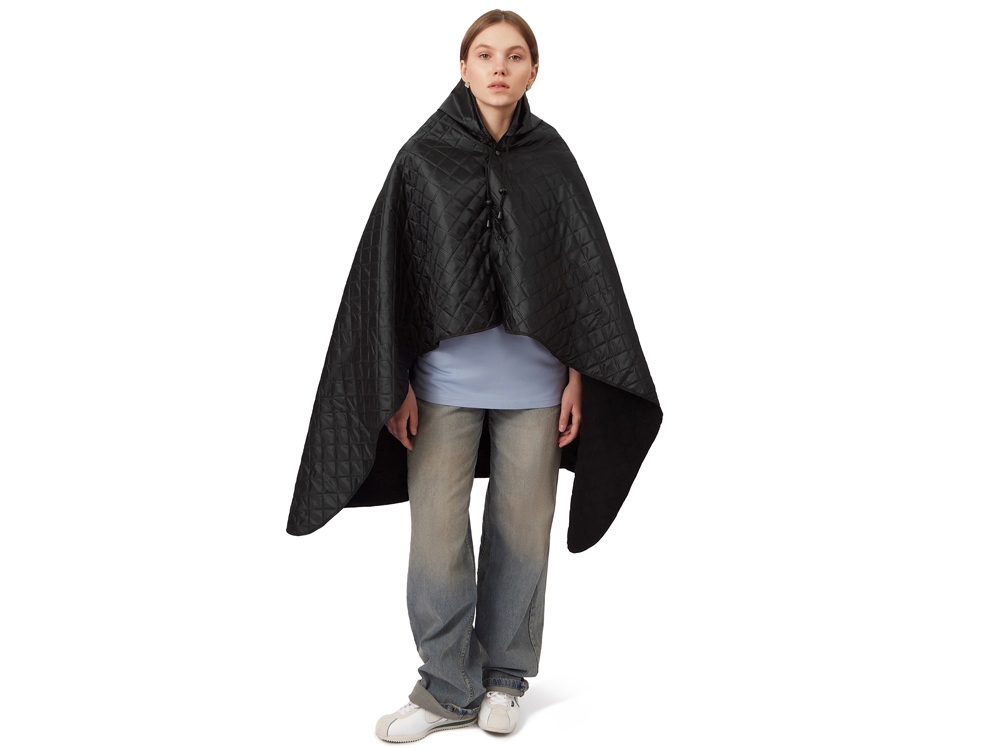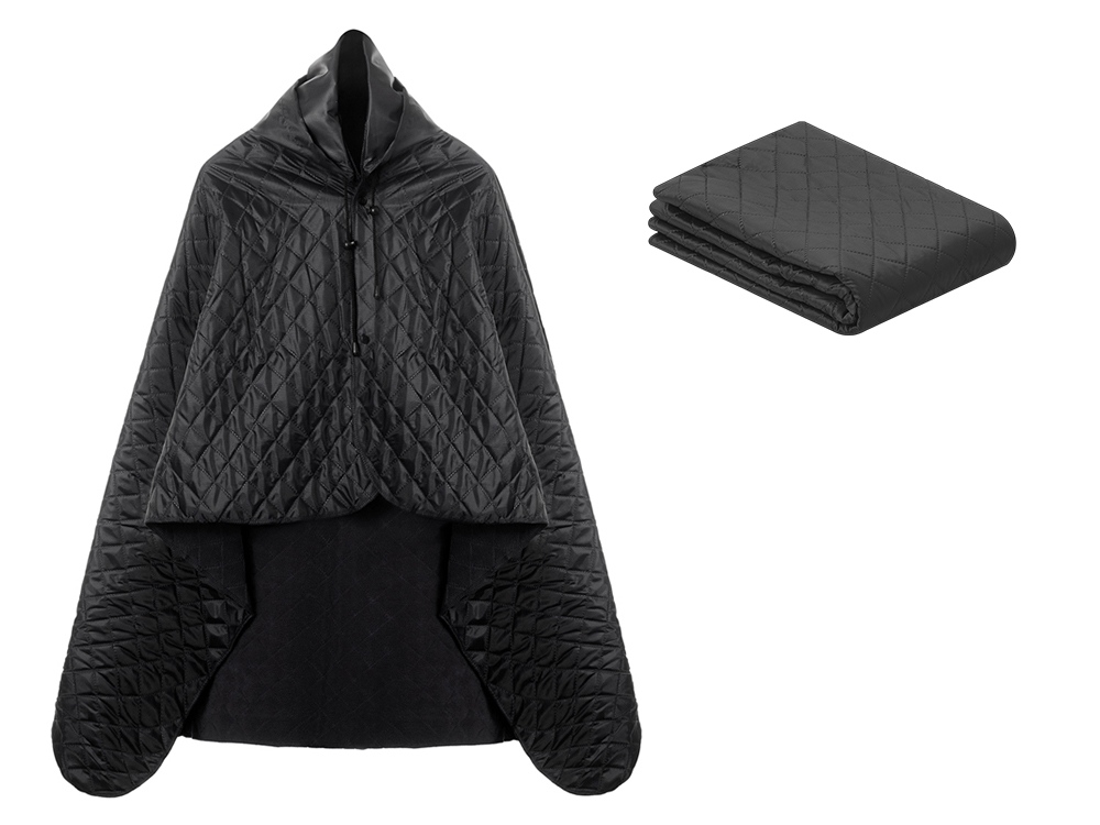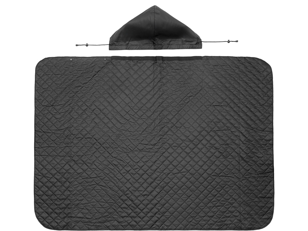 На внутренней стороне из флиса приятно и тепло сидеть, а наружная сторона из полиэстера с водоотталкивающим покрытием не позволяет пледу намокнуть или сильно испачкаться. Для больше удобства использования пледа во время дождя в комплекте идет капюшон, который фиксируется с помощью липучки. Накинув плед на плечи, застегните его на кнопки вверху и наденьте капюшон. Вы не промокните во время неожиданного дождя!
