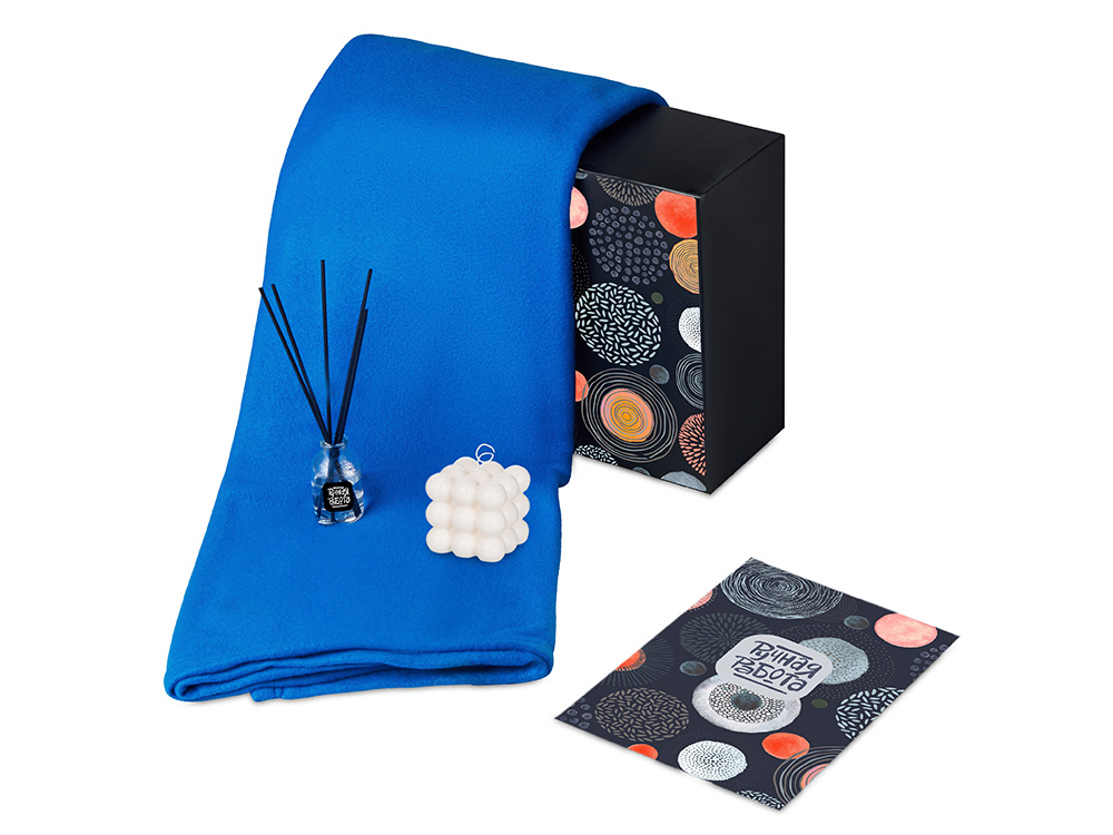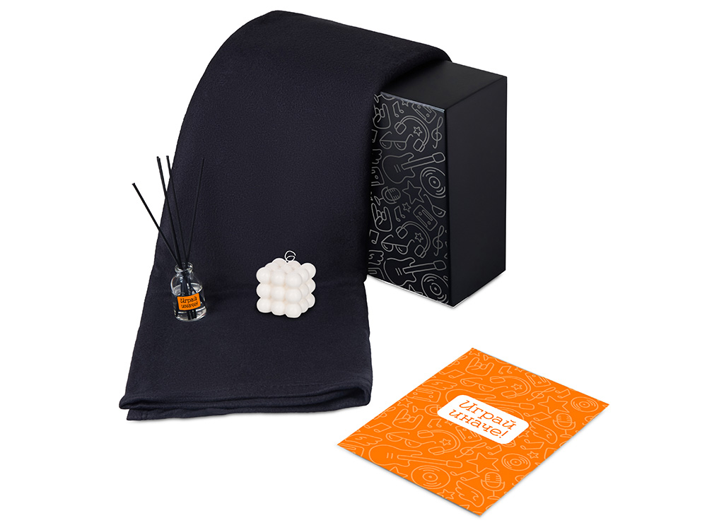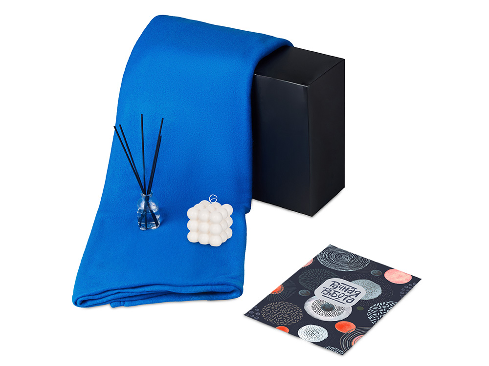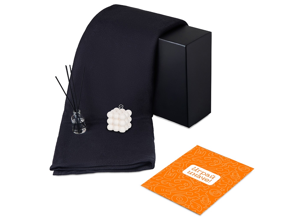 полиэстер, плед - флис, полиэстер, диффузор - стекло, свеча - 90% парафин очищенный, 10% соевого воска, фитиль хлопковый, миндаль - пластик, мешок - нетканый материал (спанбонд), коробка - картон