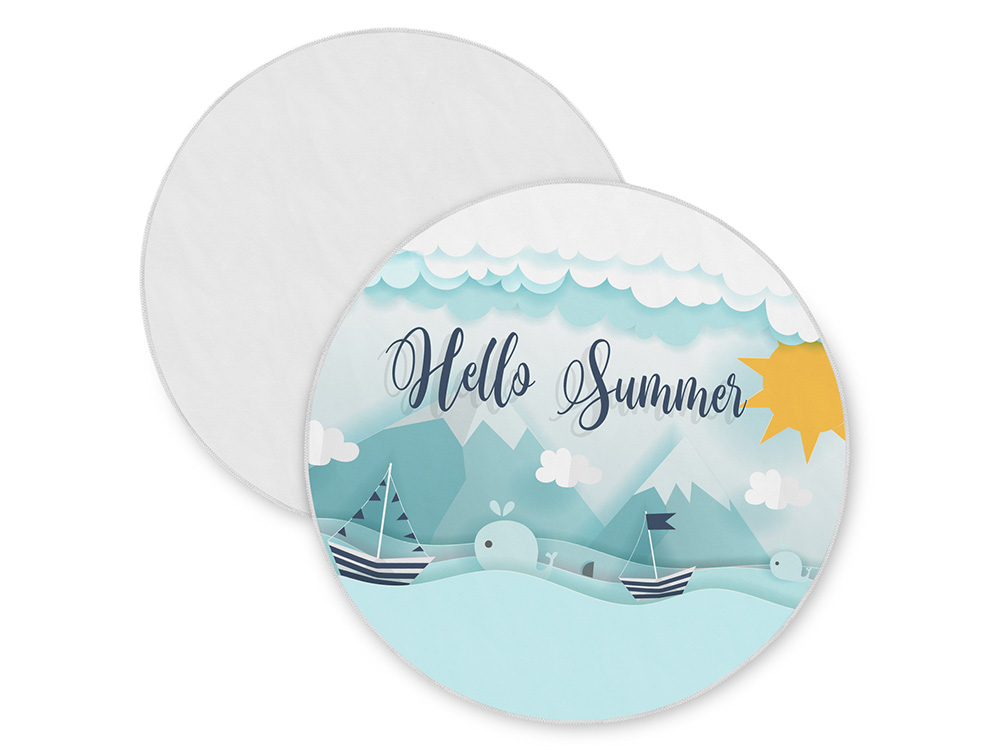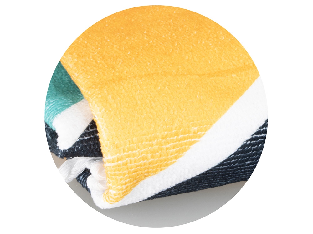 Необычный и трендовый вариант классического пляжного аксессуара. Круглая форма полотенца помогает быстро и удобно расстилать его на земле или шезлонге. Плотный полиэстер сохнет быстрее обычных тканей, поэтому полотенцу не требуется дополнительная упаковка после использования - достаточно ненадолго развесить его для просушки. Полноцветная печать на полотенце производится с помощью сублимации. Бахрома по краю может быть изготовлена в двух цветах (белый и чёрный) на выбор клиента.