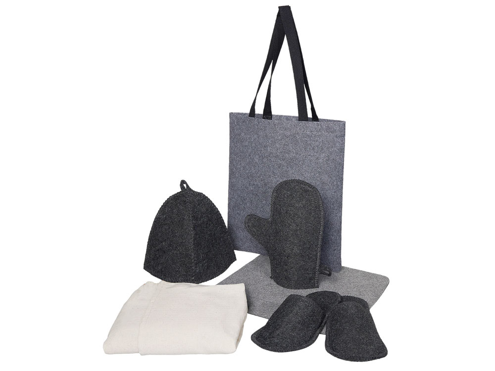Женский банный набор Healing для комфортного отдыха: лежак для бани, холщовый килт-парео, рукавица, шапка и тапочки — всё аккуратно упаковано в стильный фетровый шоппер.