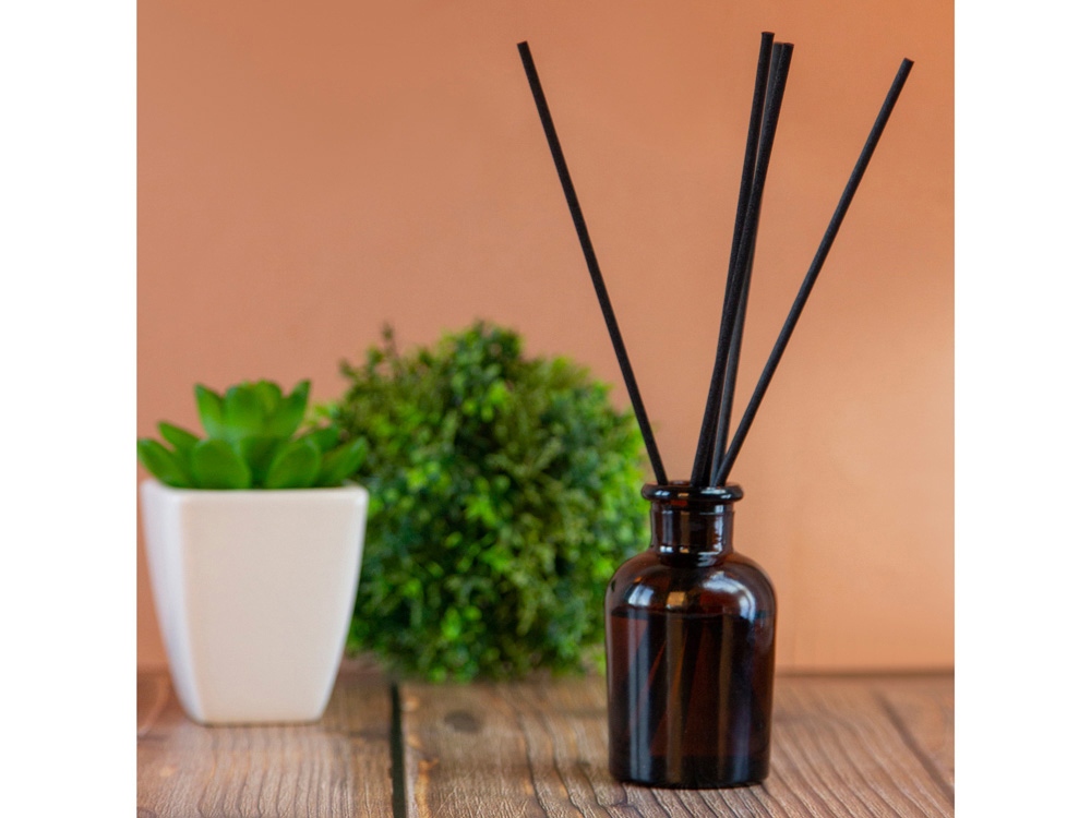 Объём диффузора 50 мл. Его будет достаточно для умеренного поддержания аромата в комнате до 15м2 в течение двух месяцев использования. Насыщенность аромата регулируется количеством используемых фибровых палочек.