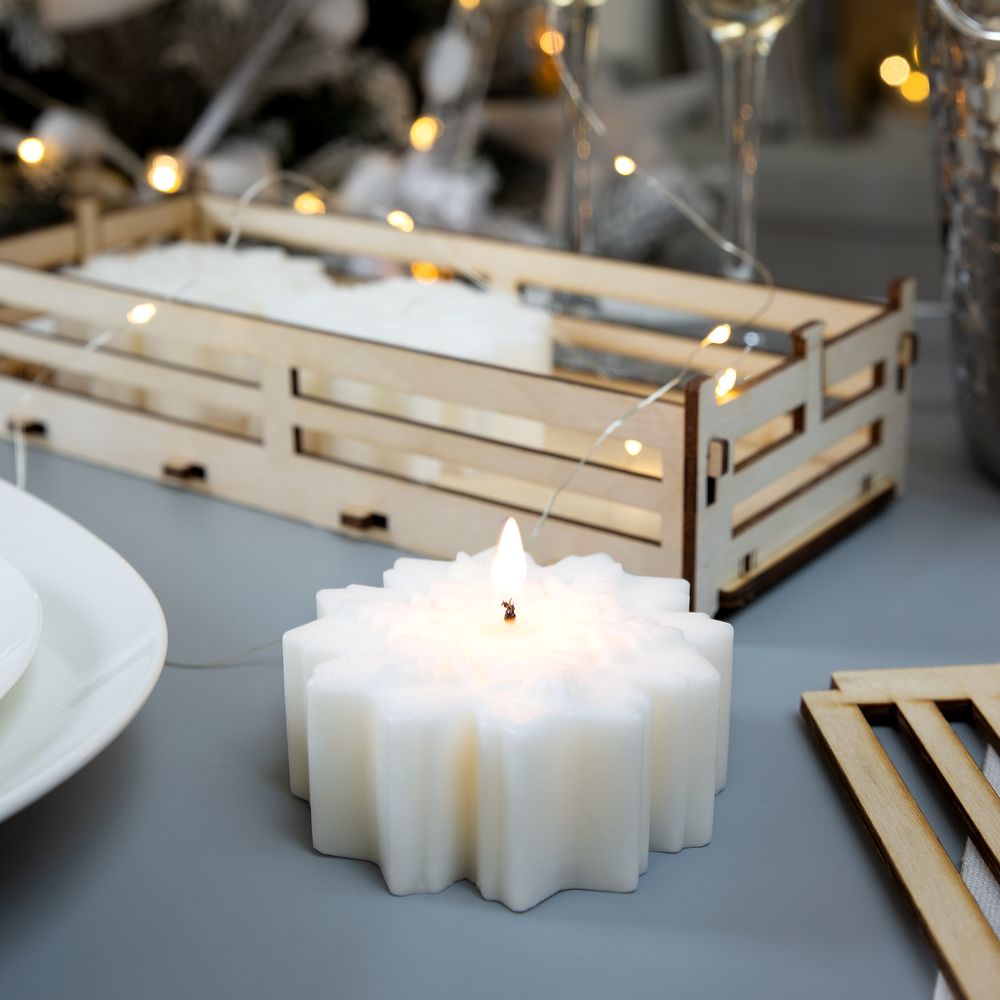 Набор из трех свечей в фанерном ящичке. Каждая снежинка в наборе представлена в своем неповторимом узоре.Набор из 3 свечей в ящике. Каждая снежинка упакована в отдельный полиэтиленовый пакет.