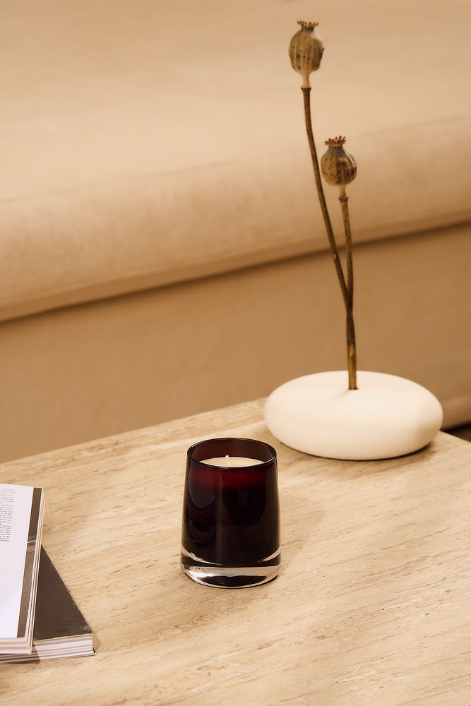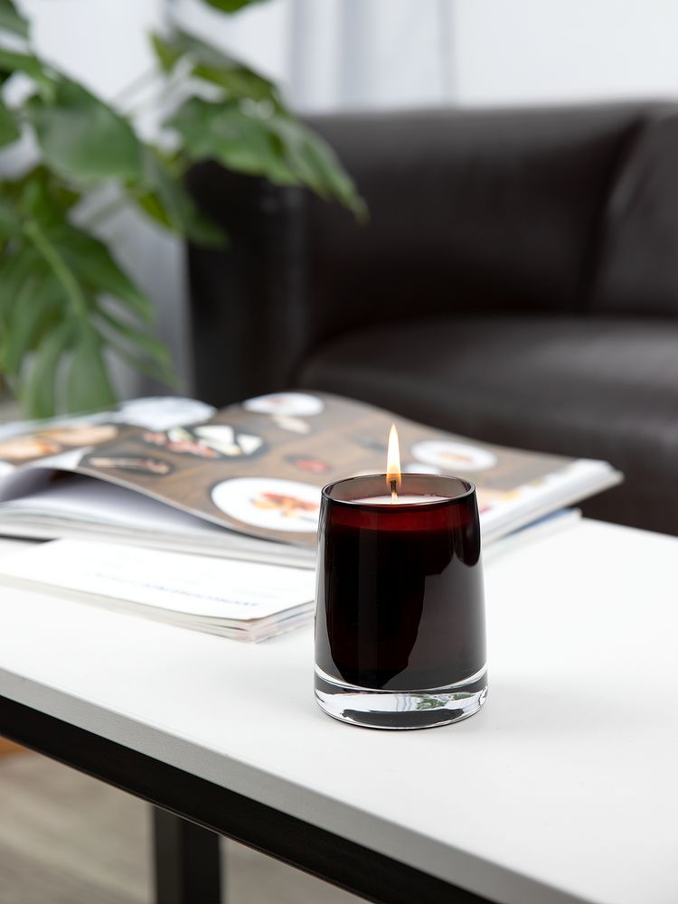 Ароматическая свеча Fragnola в изящном подсвечнике из цветного стекла идеально подходит для создания уютной атмосферы в доме и станет отличным дополнением к любому интерьеру.
