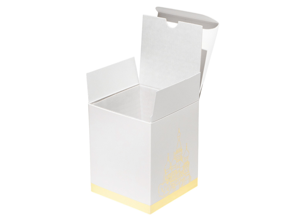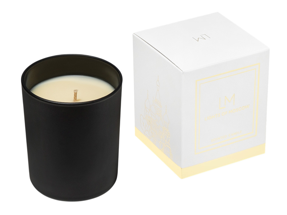 Коллекция аромасвечей Exclusive является уникальной не только из-за ароматов коллекции, но и благодаря тщательно разработанному дизайну упаковки, которая является напоминанием о том, что бренд Lights of Moscow - это ручное российское производство в самом центре Москвы. Белая коробка оформлена ярким золотым фольгированием, на левой стороне которой изображен Храм Василия Блаженного - одна из главных достопримечательностей на Красной площади в Москве.