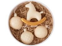 Набор свечей в подарочной коробке Noel - элегантный штрих к праздничному декору. В круглой коробке с крышкой — три свечи в форме новогодних шаров и одна в виде лошадки, выполненные из утончённой смеси кокосового, соевого воска и парафина.
