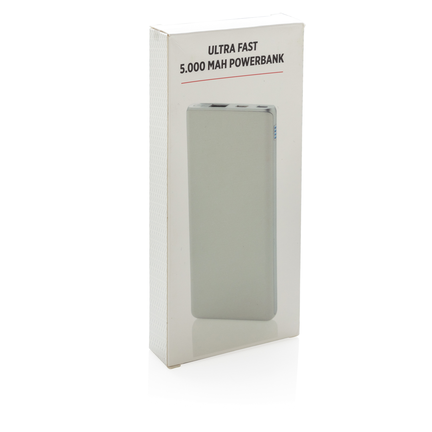 Стильный внешний аккумулятор емкостью 5000 мАч с быстрой зарядкой, доступной на рынке. Изготовлен из прочного пластика ABS. Предусмотренные разъемы - Type C и стандартный USB-порт. Вход Micro USB: 5V / 2A; USB-выход: 5V / 2.4A. Вход Type C: 5V / 2A. Выход Type C: 5V / 3A.