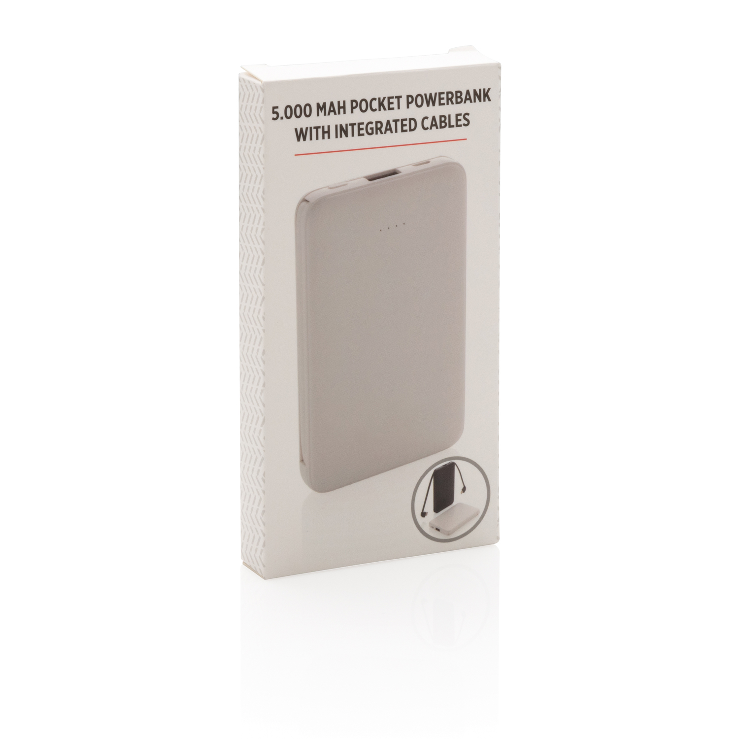 Этот компактный пауэрбанк с приятным на ощупь матовым корпусом из ABS легко носить с собой. Емкость аккумулятора составляет 5000 мАч. В корпус устройства встроены TPE кабели с разъемом Type C и комбинированным разъемом для устройств на платформе iOS и на платформе Android (micro USB). Энергии полностью заряженного литий-полимерного аккумулятора высокой плотности хватит, чтобы зарядить ваш смартфон до двух раз. Удобные световые индикаторы отображают уровень заряда, напоминая о необходимости подзарядить устройство. Напряжение на входе и на выходе: 5V/2A.