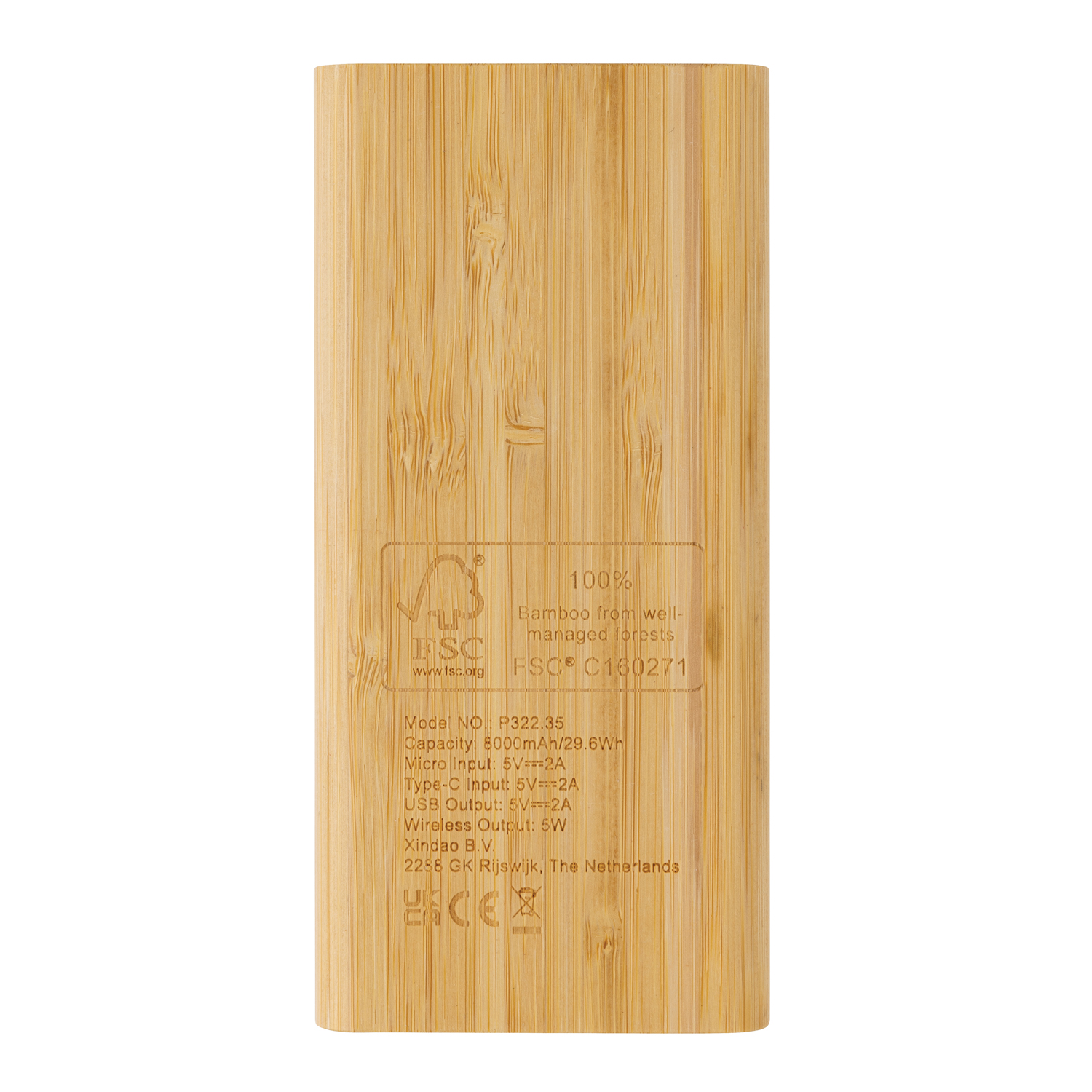 Устройство для беспроводной зарядки мощностью 5 Вт выполнено из натурального бамбука, сертифицированного FSC®. Емкость литий-полимерного аккумулятора класса А составляет 8000 мАч. Подходит как для беспроводной зарядки, так и для стандартной через кабель. Есть индикаторы питания, которые всегда подскажут, когда устройство нужно подзарядить. Беспроводная зарядка подходит для смартфонов, поддерживающих стандарт QI: последнее поколение Android, iPhone 8 и выше. Вход micro и Type-c DC5V/2A; Выход USB-A, micro USB и Type-C DC5V/2A; Выход беспроводной зарядки: 5V/1А. Поставляется с кабелем для зарядки из переработанного материала TPE. Не содержит ПВХ. Упаковка FSC®mix.