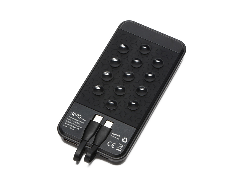 Универсальный внешний аккумулятор с функцией беспроводной зарядки. Имеет 2 встроенных кабеля USB-C и Lightning, также есть отдельный зарядный кабель micro USB в комплекте. На корпусе имеются присоски для надежного крепления к смартфону.