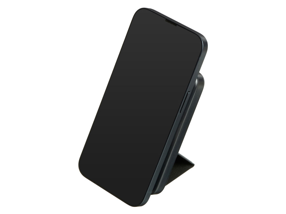 Сзади расположена пластичная складная подставка из качественного полиуретана с зернистой текстурой. В развернутом виде на столе подставка позволяет пользоваться смартфоном одной рукой, при этом, благодаря магнитным держателям, смартфон может быть расположен как вертикально, так и горизонтально.