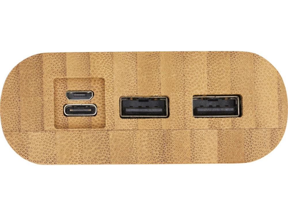 Портативное зарядное устройство емкостью 20 000 мАч из бамбука с сенсорной кнопкой включения/выключения и 4 светодиодными индикаторами для отображения оставшейся емкости батареи. Вход Micro USB 5 В/2 А, вход Type-C 5 В/3 А, выход Type-C 5 В/3.1 А макс., двойной выход USB-A 5 В/3.1 А макс., общая мощность 15.5 Вт. Поставляется с зарядным кабелем Type-C - Type-C 3 А из термополиэтилена длиной 30 см, инструкцией по эксплуатации и подарочной коробкой из крафт-бумаги. Поскольку бамбук — природный материал, цвет и размер сырья могут быть разными, что, в свою очередь, может повлиять на итоговый вид печати.
