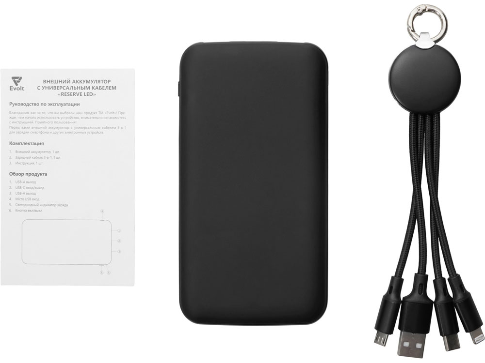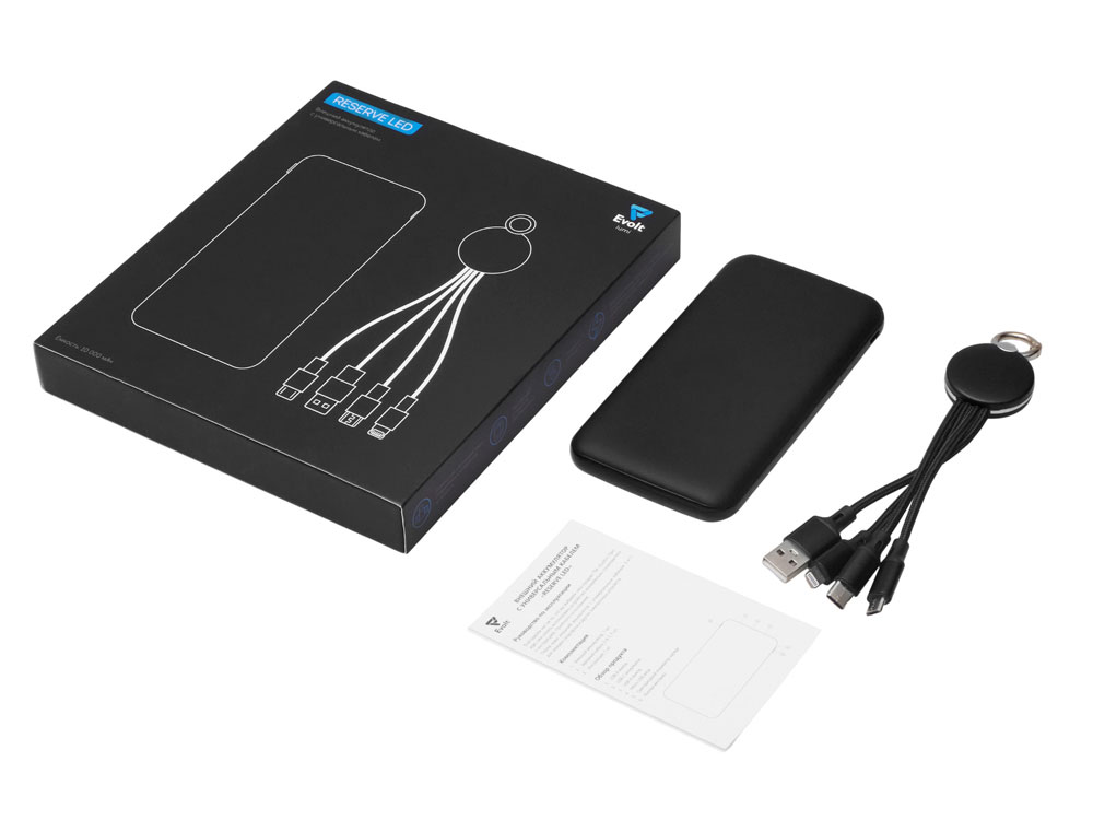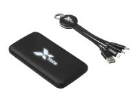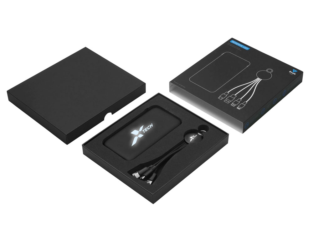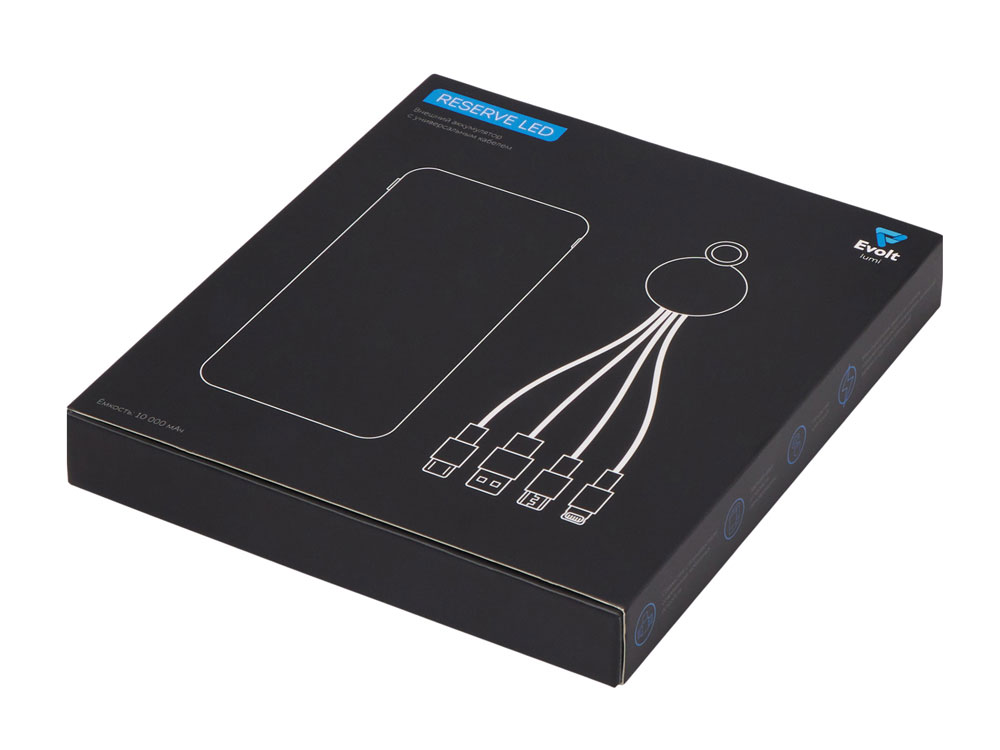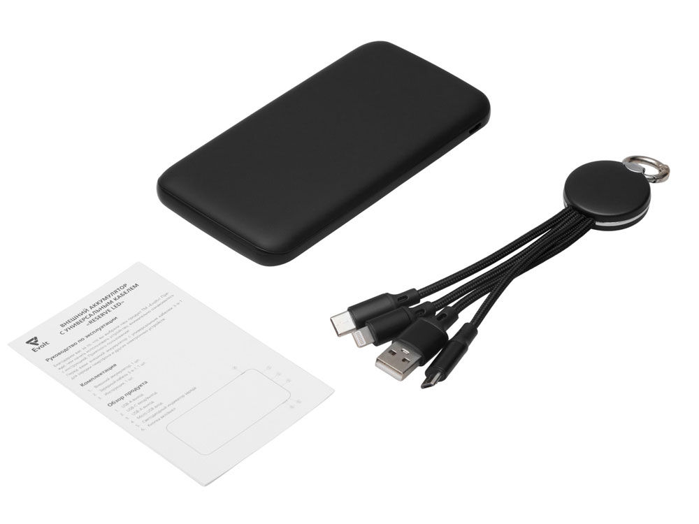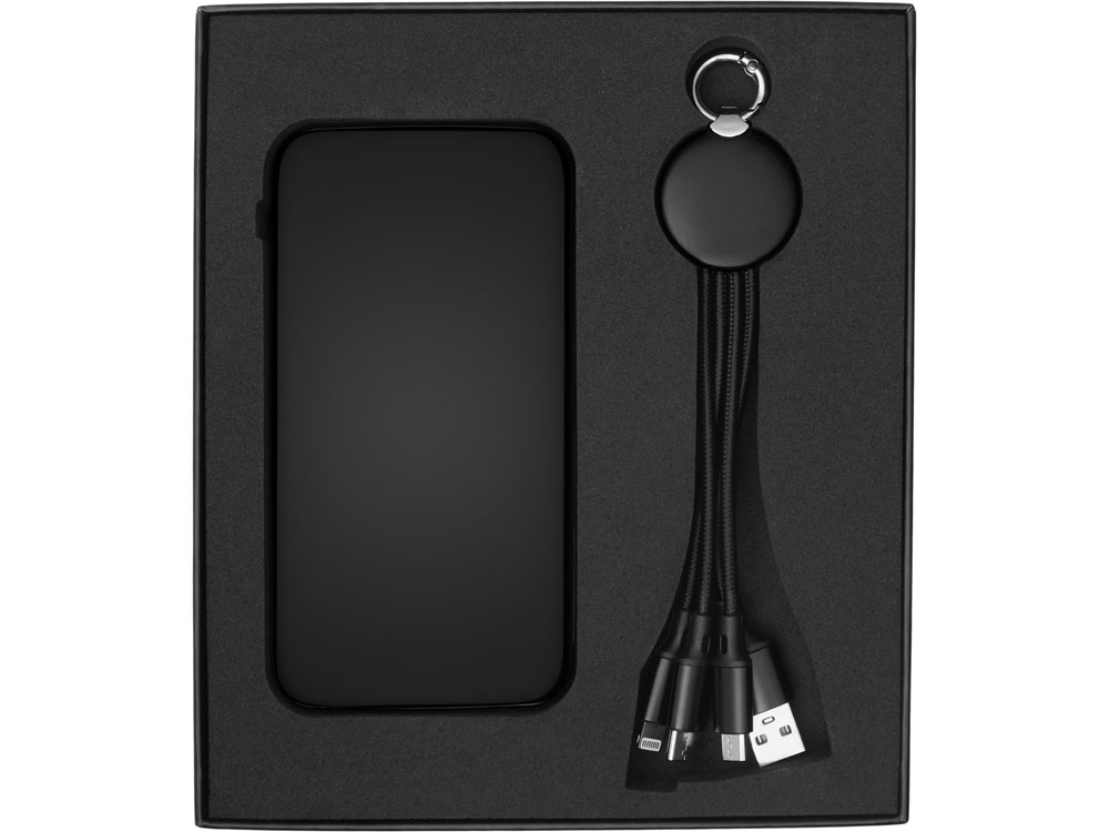 Практичный и стильный набор для зарядки в дороге: внешний аккумулятор на 10 000 мА·ч и универсальный кабель с тремя разъёмами (Micro USB, Lightning, USB Type-C). Оба элемента комплекта оснащены подсветкой логотипа — ваш бренд всегда на виду, даже в темноте. Повербанк обеспечивает 2–3 полных заряда смартфона и оснащён двумя выходами (USB-A и USB-C) для одновременной зарядки двух устройств. Поставляется в прочной подарочной коробке с шубером  — идеальное решение для корпоративных подарков.