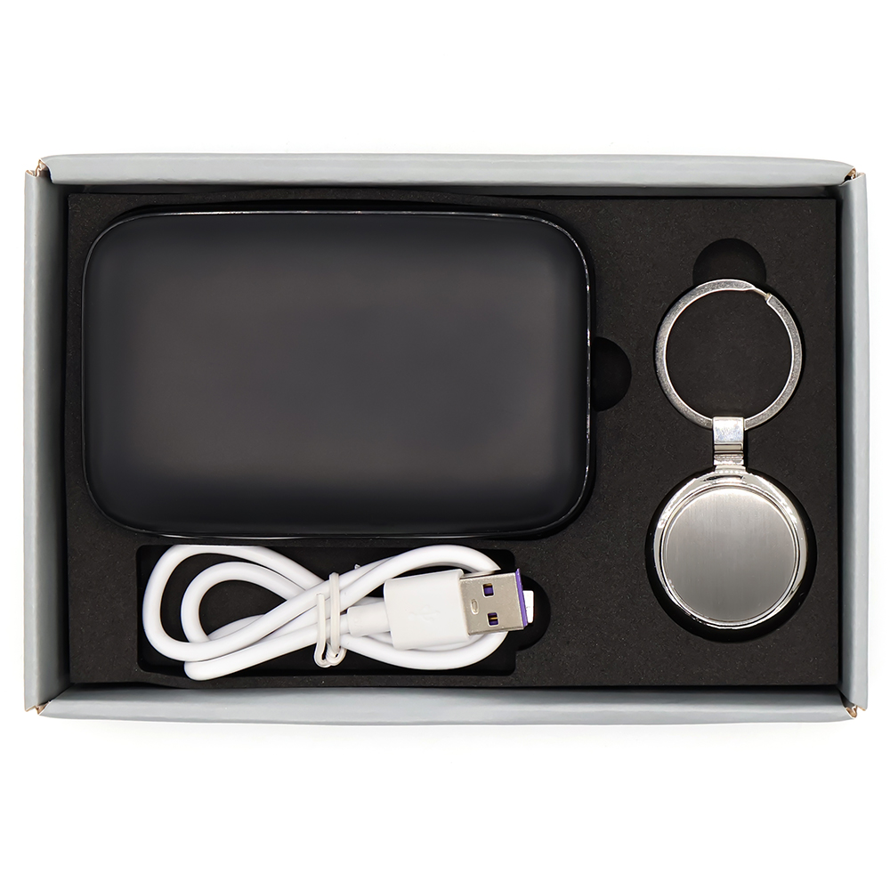 Подарочный набор в элегантной цветной картонной коробке серого цвета с конструкцией крышка-дно. Внутри расположены аккуратно закрепленные на ложементе внешний аккумулятор емкостью 10000 mAh с быстрой зарядкой, и металлический карманный брелок. Внешний аккумулятор обладает компактным дизайном и обеспечивает надежный запас энергии для мобильных устройств в пути, а стильный металлический брелок станет практичным и эстетичным аксессуаром для ключей. Этот набор идеально подходит в качестве презента для тех, кто ценит удобство, качество и современный стиль.