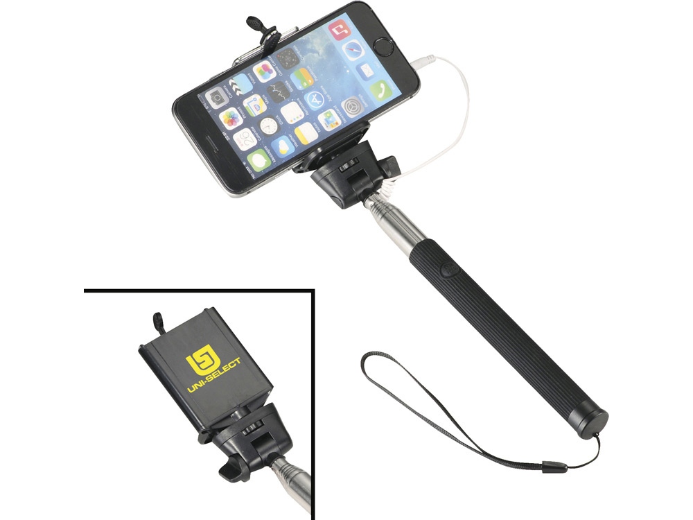 Проводной монопод. Сделайте идеальный селфи с этим выдвижным моноподом (до 90 см). Не требует батареи или использования приложения. Просто подключите 3,5 мм аудио разъем в телефон (совместим со всеми мобильными телефонами IOS) и нажмите на кнопку, расположенную на ручке. Регулируемый держатель телефона подходит для всех смартфонов. Силикон, сталь и ПВХ.