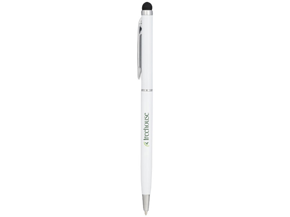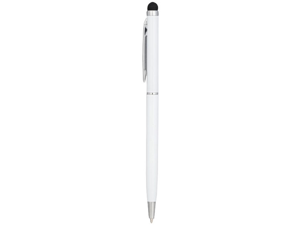 Алюминиевая шариковая ручка Joyce. Тонкая алюминиевая шариковая ручка с поворотным механизмом и стилусом. Алюминиевый корпус с металлическим зажимом и кольцом посередине, остальные элементы из пластика.
