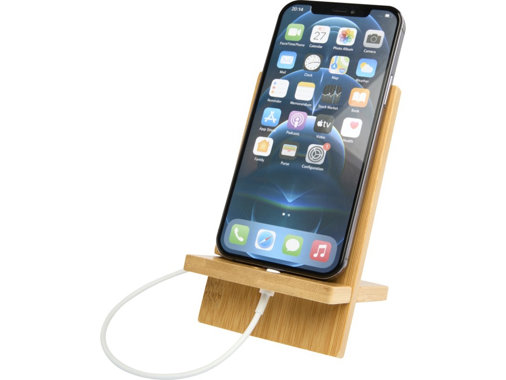 Съемная подставка для телефона Ceibo изготовлена из бамбука, полученного ответственным образом. Подставка оснащена удобным углублением для разъема кабеля, что обеспечивает легкую зарядку и надежную фиксацию устройства на месте.