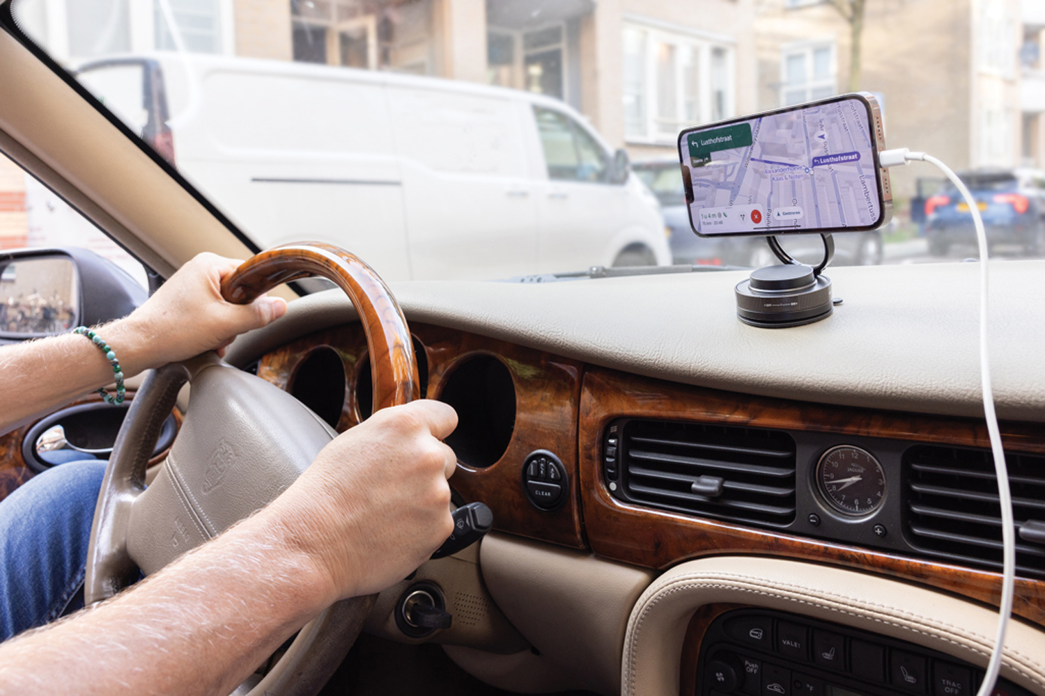 Смартфон крепится к держателю благодаря надежному магниту. К зеркальным и стеклянным поверхностям сам аксессуар может присасываться силой до 84 Н, что гарантирует безопасность. Совместимость с моделями iPhone 12 и выше.