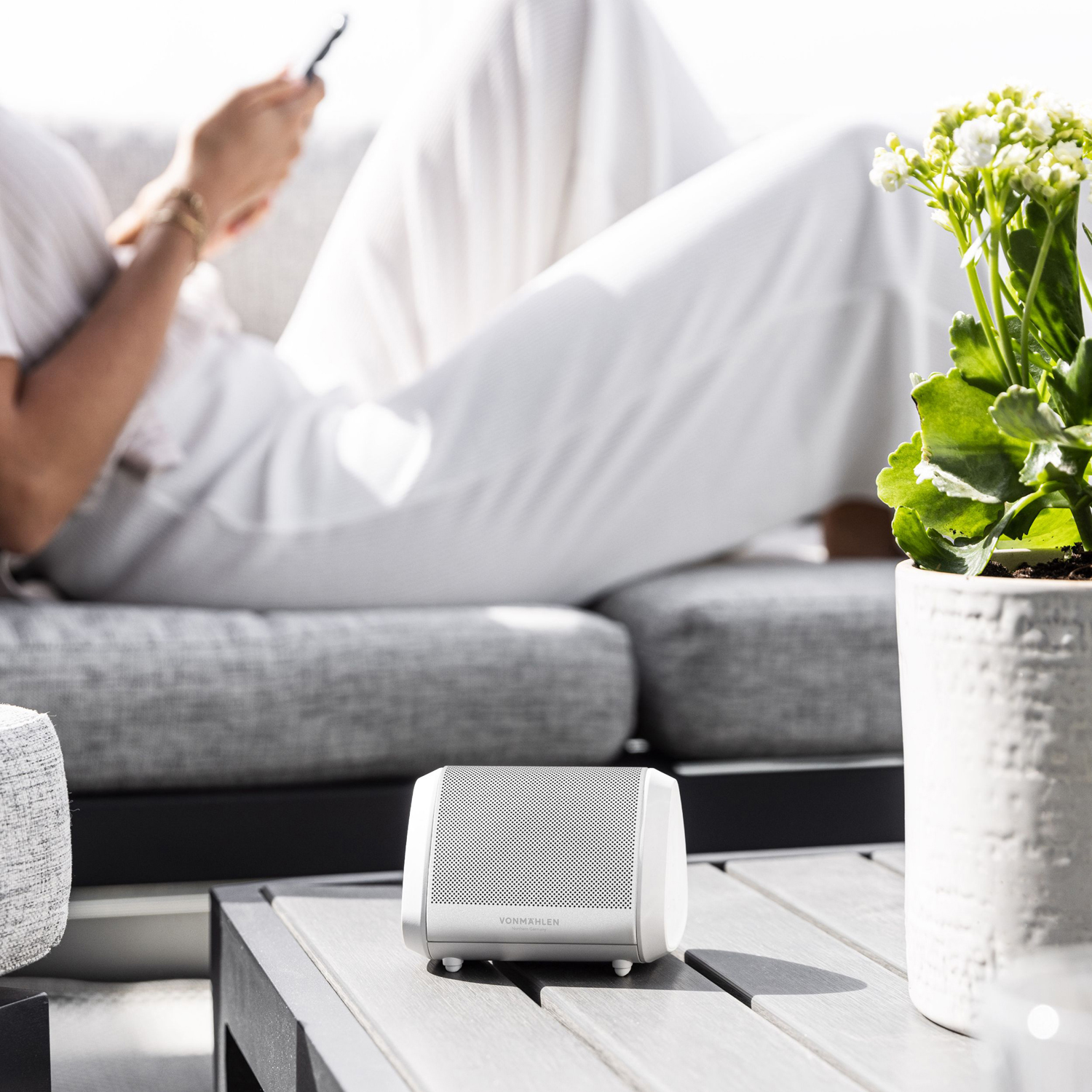 Компактная беспроводная колонка VONMAHLEN Air Beats Mini впечатляет качеством звука даже самых взыскательных меломанов. Куда бы вы ни отправились, с вами всегда будут любимые треки, поскольку колонка работает до 13 часов без подзарядки. Air Beats Mini не боится дождя: стандарт IPx6 защитит ее от струй воды или брызг с любых направлений. Ею легко управлять с помощью голосовых команд, кроме того, в колонку встроена функция ответа на телефонные звонки. Совместима с голосовыми помощниками Siri и Google Assistant. При наличии двух колонок Air Beats Mini можно добиться уникального стереозвука: достаточно подключить их друг к другу одним нажатием кнопки. Мощность колонки 5 Вт.