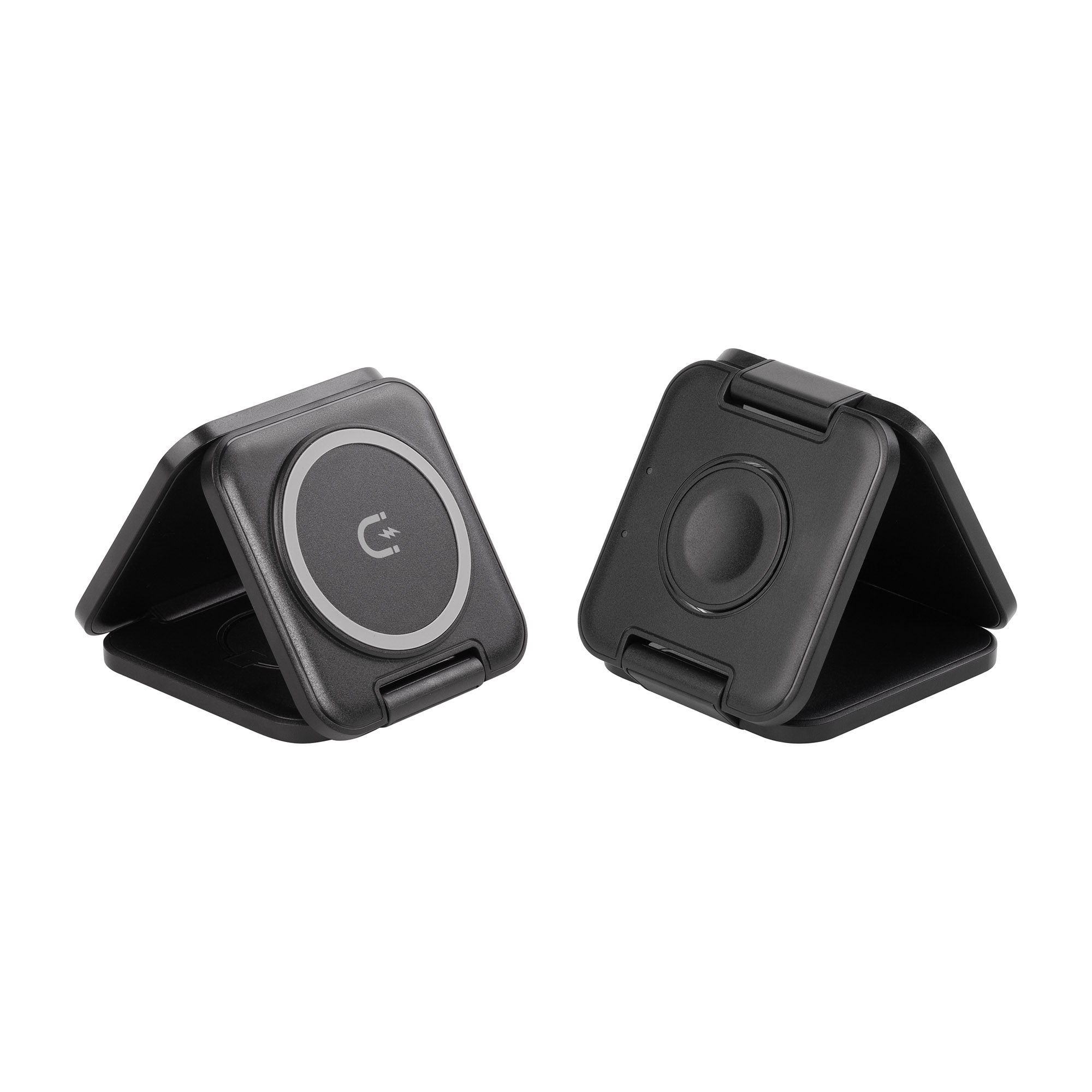 Зарядный блок станции для смартфона оснащён функцией MagSafe – магнитным держателем для iPhone двенадцатой серии и выше. Встроенные магниты слева от зарядного блока для смартфона и справа от зарядного блока для наушников позволяют сложить станцию в пирамиду-подставку - в данном положении появляется возможность закрепить iPhone горизонтально для удобного просмотра фото/видео на его экране.
