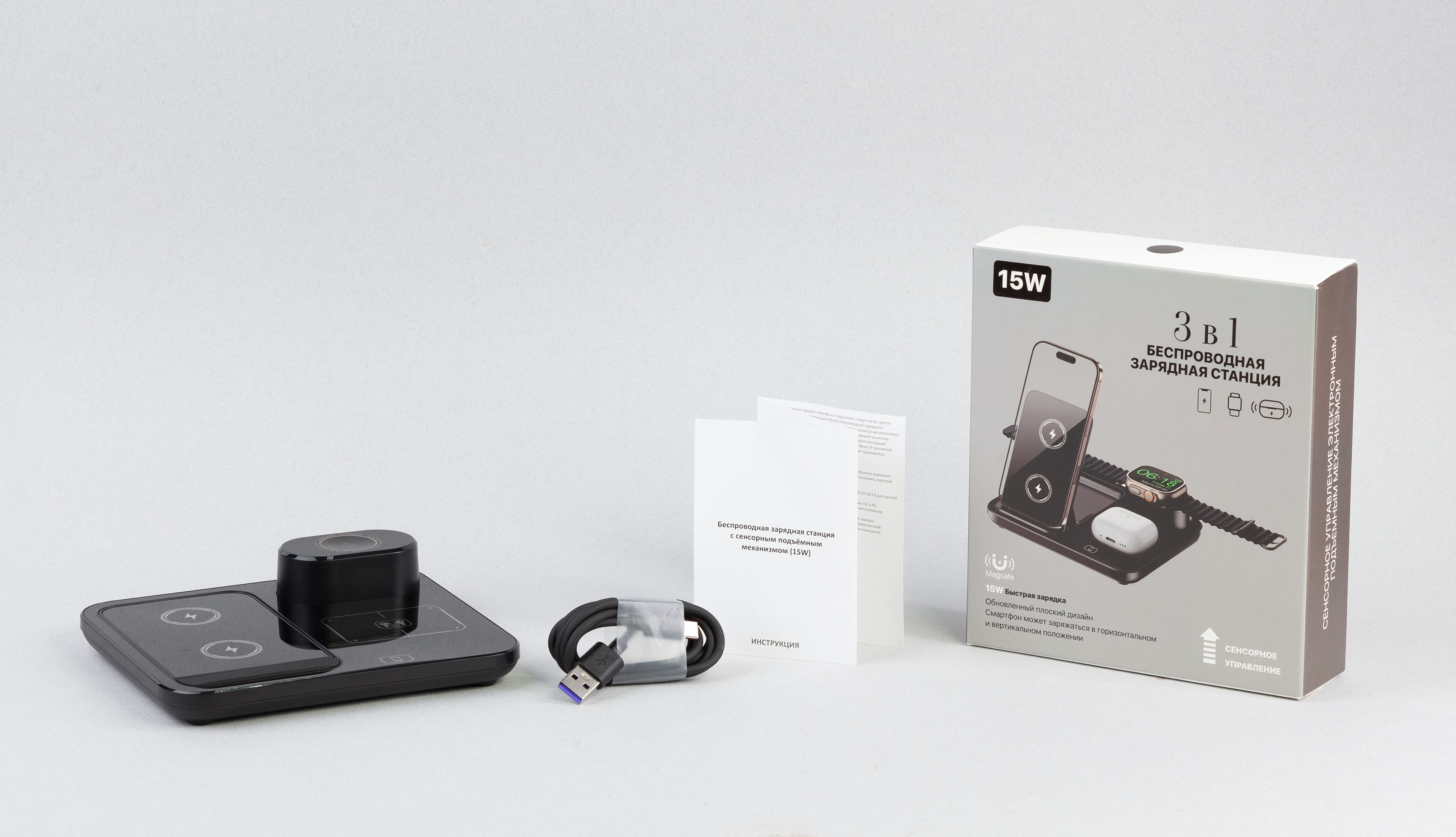 Автоматический подъёмный механизм панели для смартфона управляется сенсорной кнопкой, расположенной под зарядным блоком для наушников. Дополнительный бонус - зарядка смартфона возможна как в вертикальном, так и в горизонтальном положении (обе встроенные зарядные катушки выдают быструю зарядку до 15W).