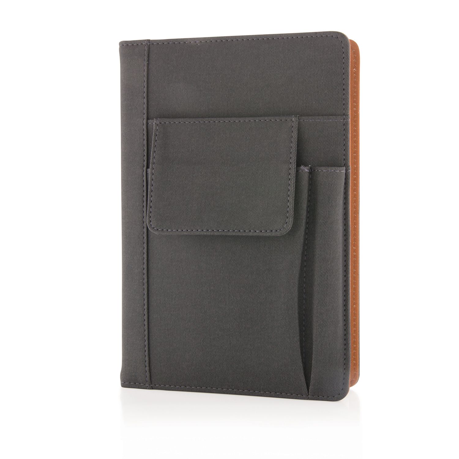 Тканевая обложка блокнота с передним отделением для телефона (14 х 10 см), с кармашком для пишущих принадлежностей и основным отделением для визиток или внешнего аккумулятора. Блокнот на 80 страниц, плотность бумаги 80 г/м2. После того как блокнот закончится, его легко поменять на новый.