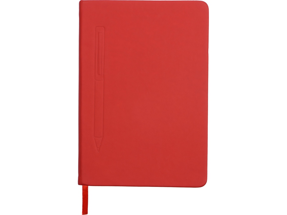 Блокнот формата А5 в твердой обложке со скруглёнными углами и блоком в линейку на 80 листов. Благодаря скрытой магнитной ленте на блокноте можно легко и надежно закрепить металлическую ручку. Зона с магнитом обозначена тиснением в форме ручки.