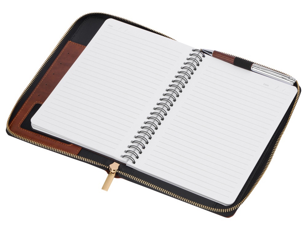 Бизнес блокнот Fabrizio состоит из пенала на молнии выполненного из искусственной кожи, и сменной тетради на 80 листов на кольцах с перфорированными линованными листами белого цвета.
