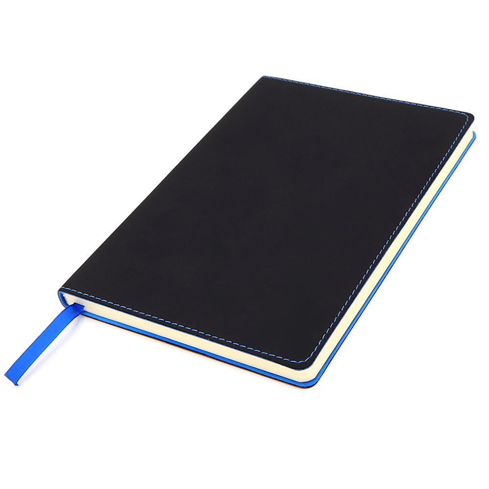 Блонот формата А5 в мягкой обложке из искусственной кожи. Материал обложки - термополиуретан. Основной цвет - чёрный; строчка по периметру, внутенний край и ляссе - красного цвета. Размеры: 214*144мм, 80 листов, разлинееные страницы, бумага плотностью 80г/м2.