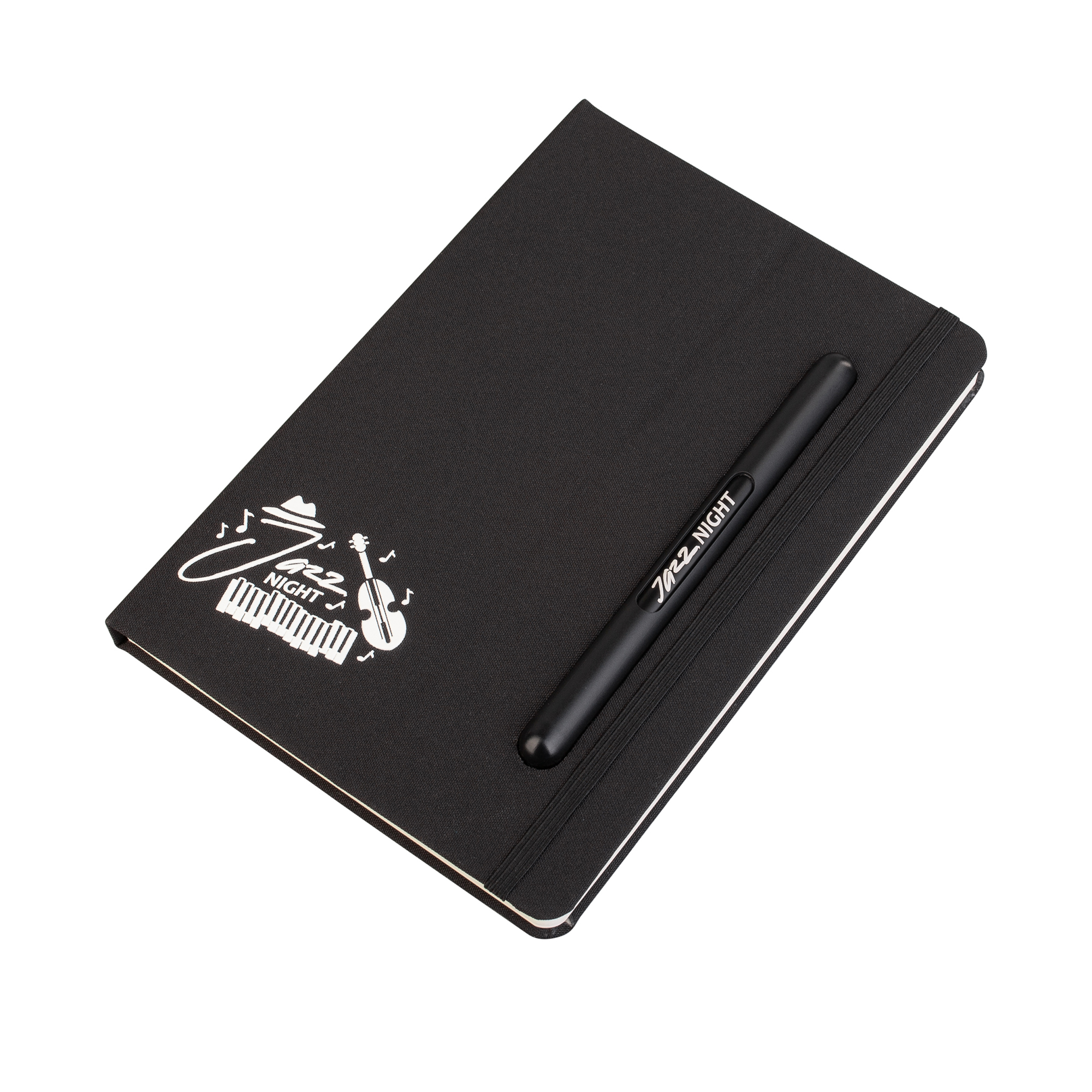 - Блокнот формата А5 с резинкой-фиксатором и встроенным пеналом под ручку-карандаш. Внутренний блок состоит из 160 страниц в линейку кремовой бумаги плотностью 80 г/м2. Через окошко пенала можно видеть нанесенный на ручку-карандаш логотип.