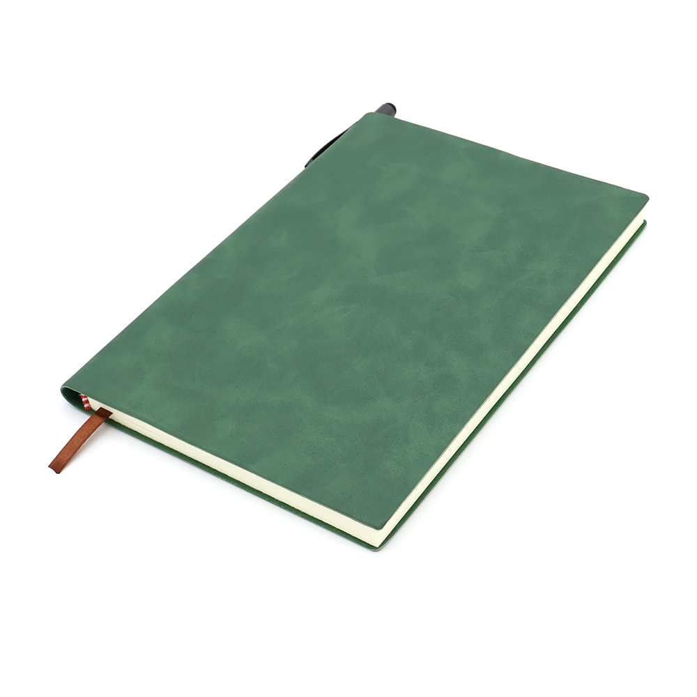 Блокнот формата А5 в мягкой обложке из искусственной кожи. Материал обложки — полиуретан. Текстура — гладкая с эмитацией натуральной кожи. Для удобства переноски ручки в корешке блокнота присутствует ниша, к которой ручка крепится за клип.