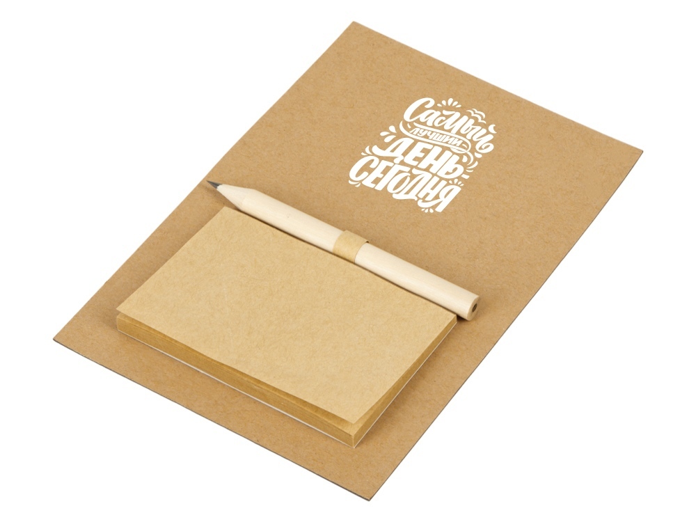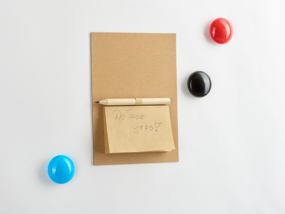 Функциональный магнит на холодильник с большим полем для нанесения логотипа и всем необходимым для заметок: в наборе идут карандаш и 40 отрывных листочков для записей.