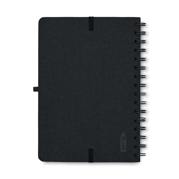 Блокнот A5 в твердой обложке с покрытием из 600D RPET с функцией подставки для смартфона. Двойная проволока. 160 линованных страниц (80 листов). Переработанная бумага 70 гсм. Эластичный ремешок.