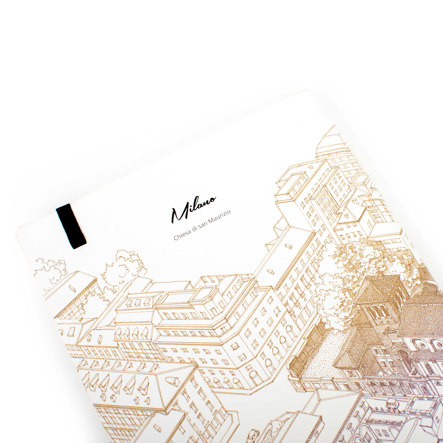Тетрадь с листами из каменной бумаги Турин из специальной коллекции Italian Beauty дизайнеров Pininfarina в сотрудничестве с Francesco Corni Foundation, посвященной красоте Италии. Франческо Корни - выдающийся дизайнер из Модены, посвятивший свою жизнь популяризации истории и архитектуры. Используя трехмерное перспективное видение, он изучает наиболее значимые здания каждого города, выбирает наилучшую точку обзора, чтобы подчеркнуть их особенности, и прорисовывает детали в древней технике калиграфии. Для Турина дизайнер выбрал центральной точкой площадь Piazza Castello и сапфировый цвет. Белая мягкая обложка фиксируется черной резинкой. Тетрадь размером А5 (14х21 см) содержит 64 листа в линейку. Листы сделаны из каменной бумаги, экологической альтернативы обычной целлюлозной бумаге, которая не требует вырубки деревьев, использования воды и агрессивных химических веществ, тем самым защищая окружающую среду. Она состоит из 80% камня (карбоната кальция) и на 20% из связующего его нетоксичного полиэтилена высокой плотности (HDPE). Это бумага нового поколения с уникальными характеристиками. Каменная бумага на 100% водоотталкивающая, ее можно мыть. Жидкости, включая масло, не изменяют ее структуру, поскольку она не содержит древесных волокон, которые поглощают жидкости, в следствие чего традиционная бумага покрывается пятнами, деформируется и разрушается. Каменная бумага устойчива к разрыву, что также способствует ее долговечности. Она имеет приятный бархатистый эффект и не отражает свет. Плотность бумаги 140 гр/м2. Ляссе черного цвета. Сделана в Италии.