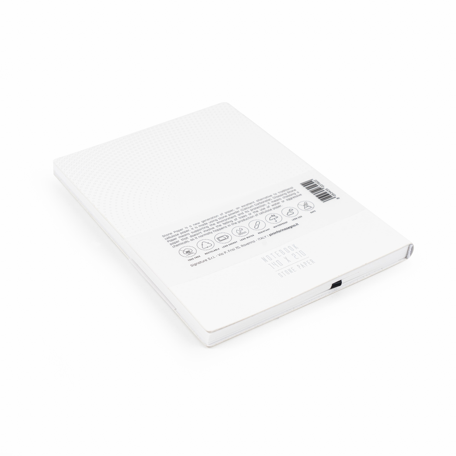 Тетрадь с листами из каменной бумаги. Дизайнеры Pininfarina создали элегантный дизайн для своего идеального дополнения к линейке вечных ручек Pininfarina Segno, так как именно на каменной бумаге они оставляют очень яркий след. Тетрадь размером А5 (14х21 см) в белой мягкой обложке с принтом Pininfarina и черным ляссе содержит 64 листа в линейку. Листы сделаны из каменной бумаги, экологической альтернативы обычной целлюлозной бумаге, которая не требует вырубки деревьев, использования воды и агрессивных химических веществ, тем самым защищая окружающую среду. Она состоит из 80% камня (карбоната кальция) и на 20% из связующего его нетоксичного полиэтилена высокой плотности (HDPE). Это бумага нового поколения с уникальными характеристиками. Каменная бумага на 100% водоотталкивающая, ее можно мыть. Жидкости, включая масло, не изменяют ее структуру, поскольку она не содержит древесных волокон, которые поглощают жидкости, в следствие чего традиционная бумага покрывается пятнами, деформируется и разрушается. Каменная бумага устойчива к разрыву, что также способствует ее долговечности. Она имеет приятный бархатистый эффект и не отражает свет. Плотность бумаги 140 гр/м2. Сделана в Италии.