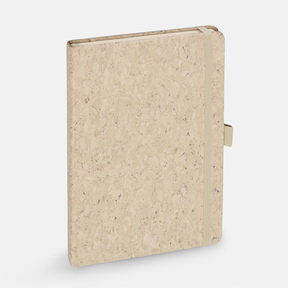 Блокнот с твердой обложкой из натуральной окрашенной пробки, дополнен петлей-резинкой для ручки, ляссе и резинкой в цвет обложки.