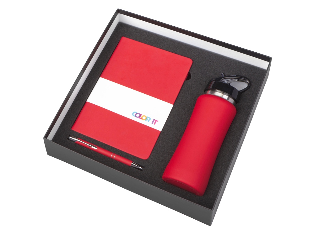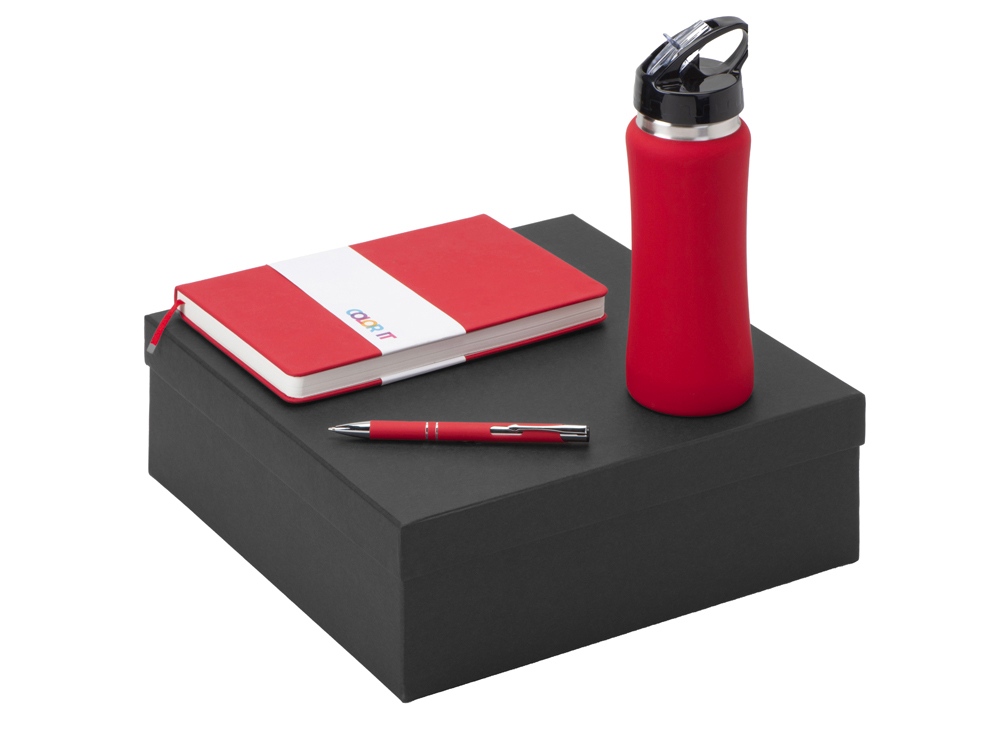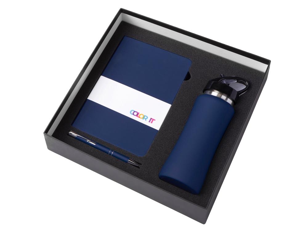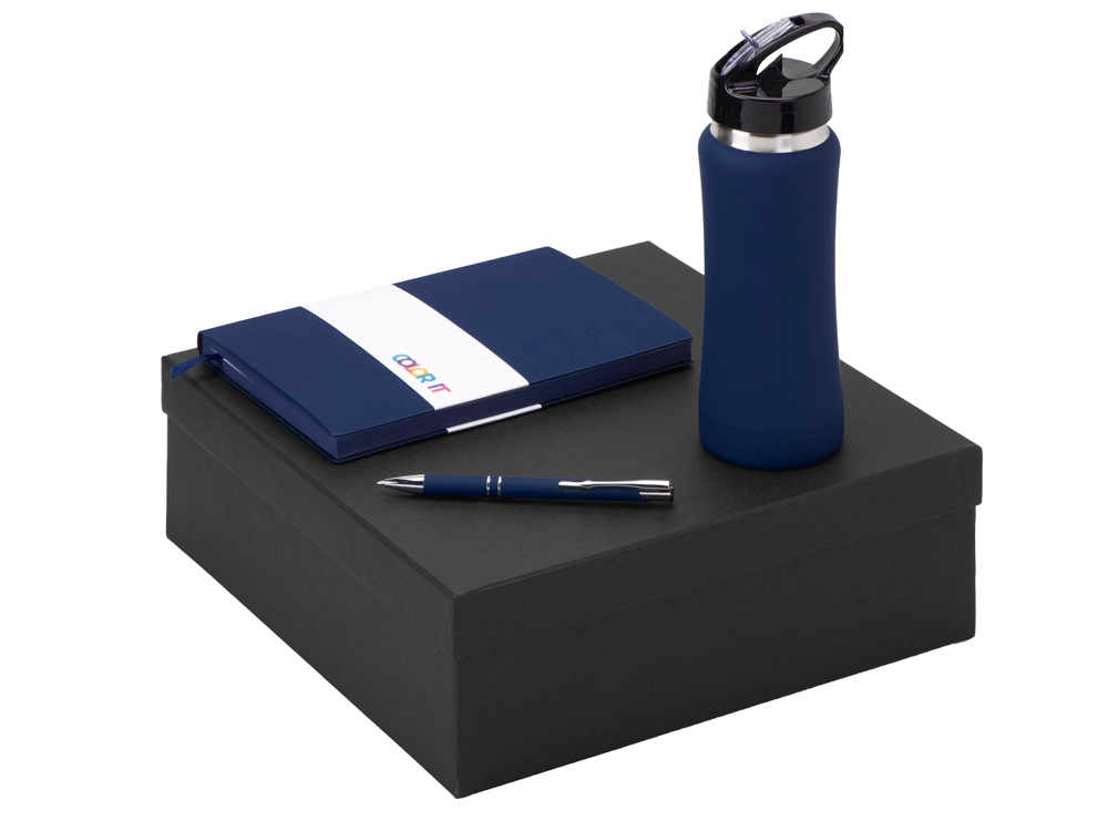блокнот - полиуретан с покрытием софт-тач, ручка - алюминий с покрытием soft-touch, бутылка - нержавеющая cталь/пластик с покрытием soft-touch, коробка - картон