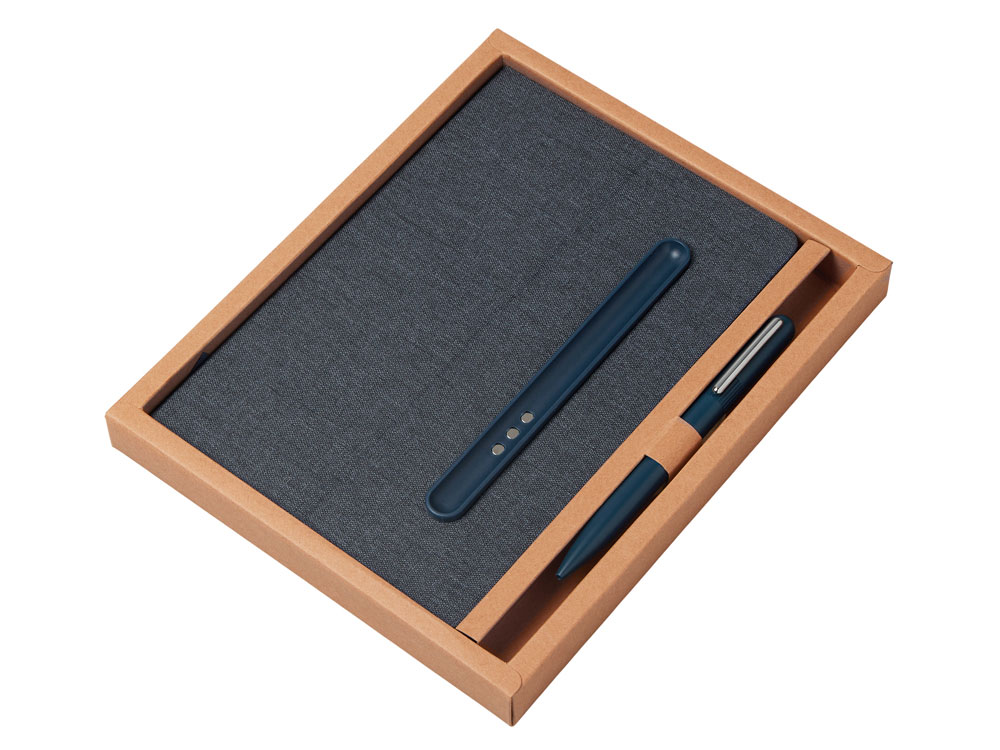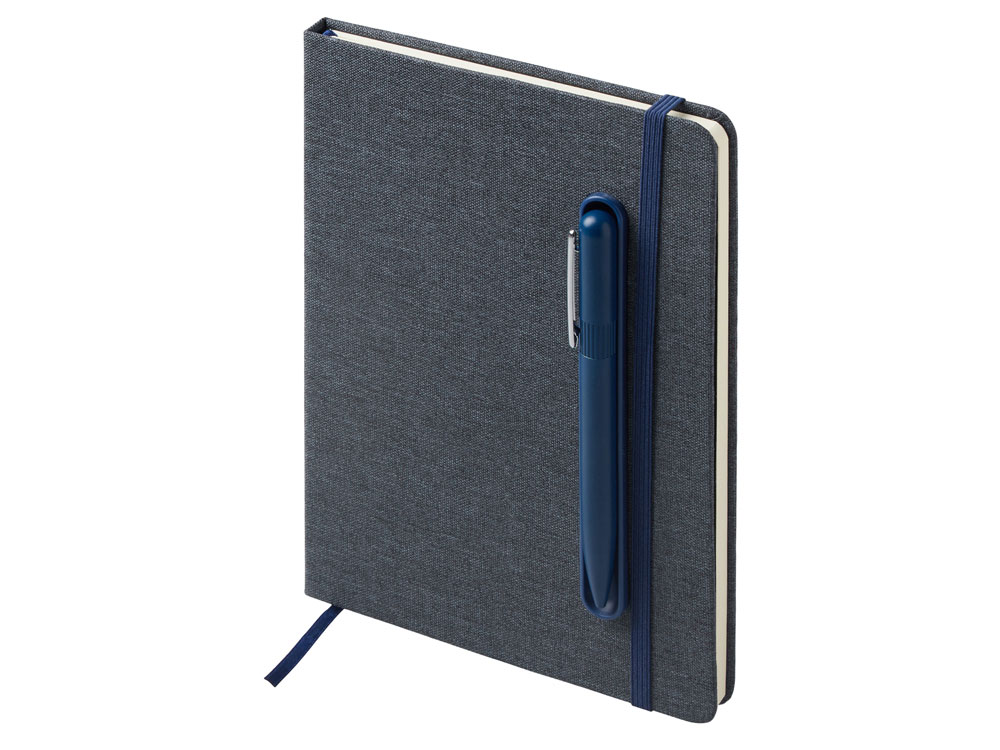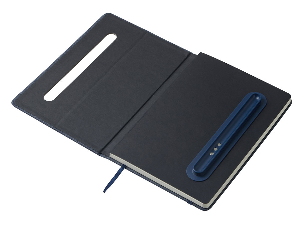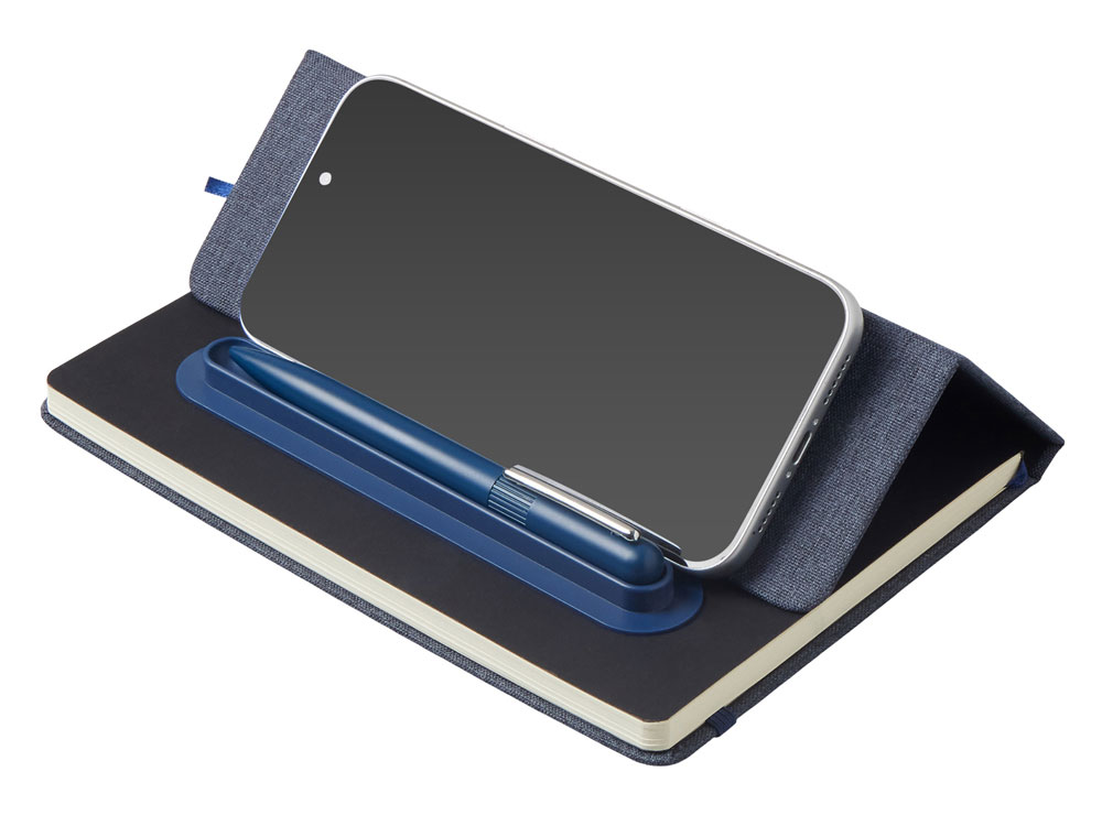 Блокнот в твердой обложке из rpet-пластика с металлической шариковой ручкой. В обложке магнитный держатель для ручки. Также верхняя часть обложки трансформируется в подставку для телефона.