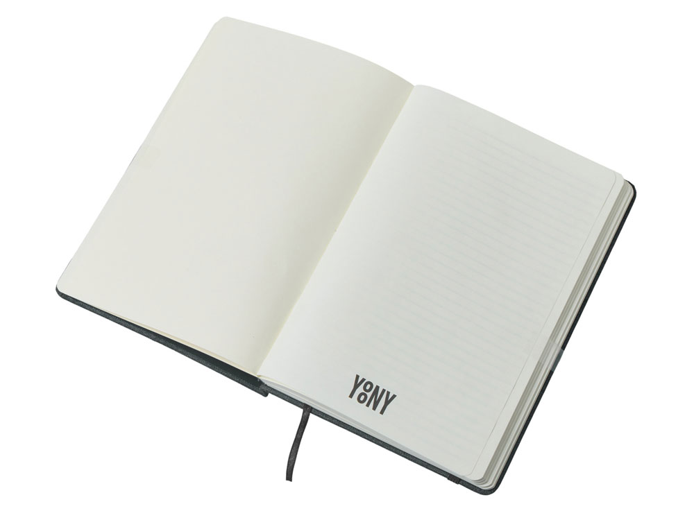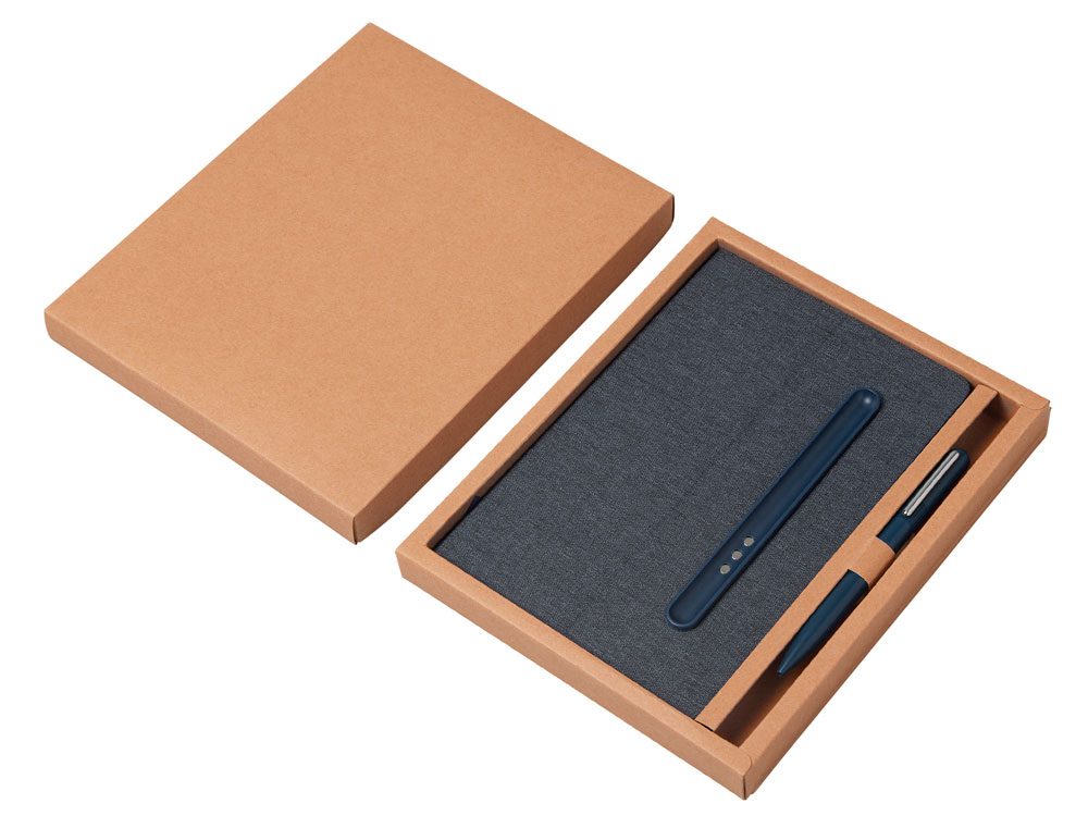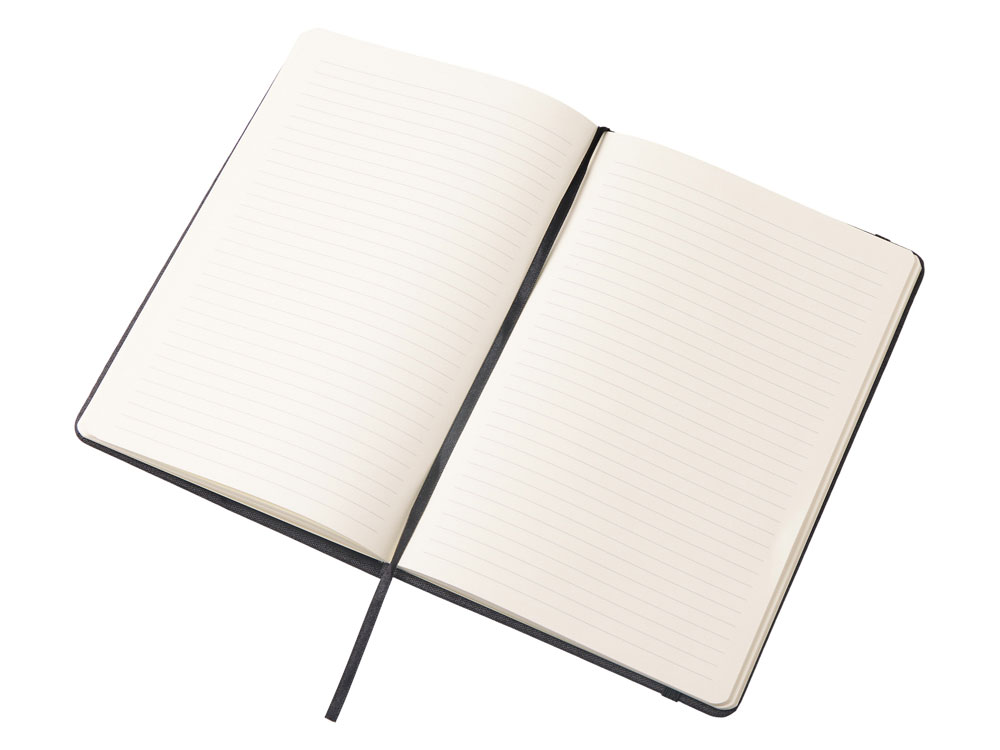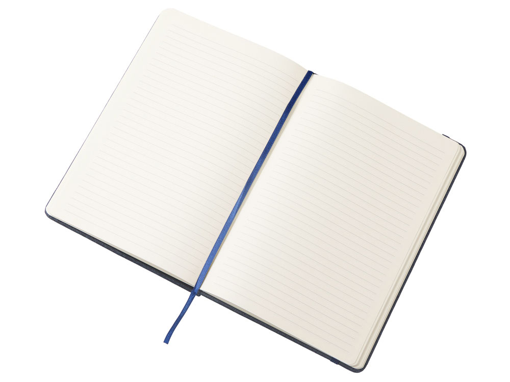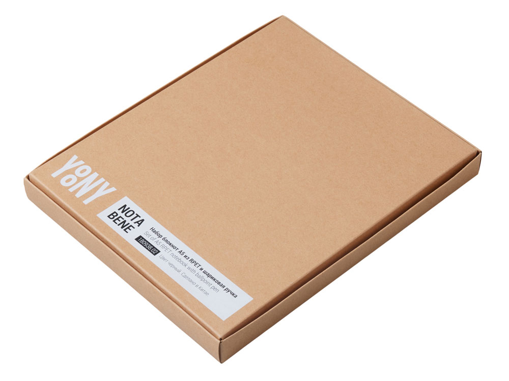 Блокнот в твердой обложке из rpet-пластика с металлической шариковой ручкой. В обложке магнитный держатель для ручки. Также верхняя часть обложки трансформируется в подставку для телефона.