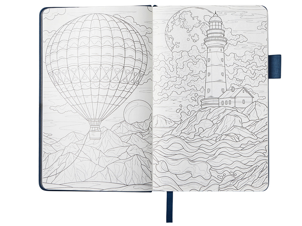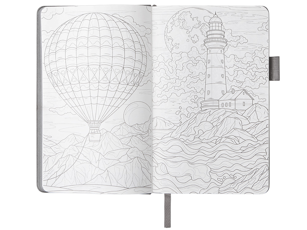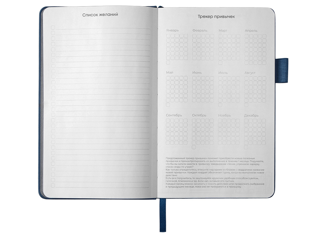 Необычный для блокнота вводный блок включает трекер привычек, списки книг и фильмов, а также 4 страницы для раскрашивания с картинками и мандалами.