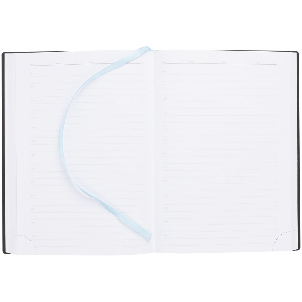 Ежедневник с гибкой обложкой, выполнен из материала Latte, голубой JJ, дополнен резинкой шириной 1 см с металлическим шильдом, капталом и ляссе голубого цвета.