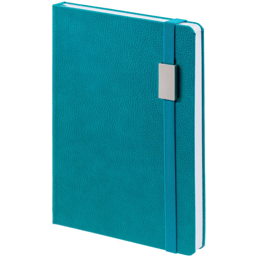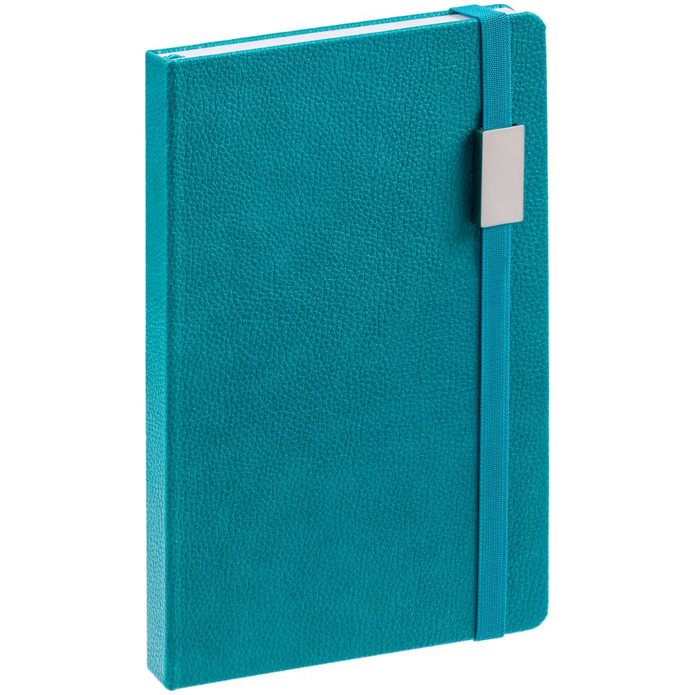 Зауженный ежедневник с прямоугольным металлическим шильдом на резинке.