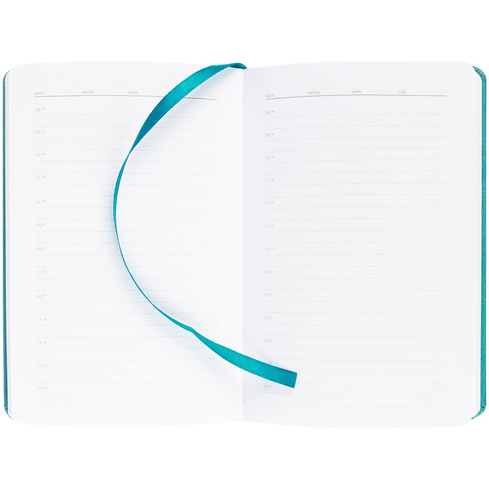 Ежедневник с твердой обложкой, выполнен из материала Latte, зеленый FF, дополнен ляссе в цвет обложки.