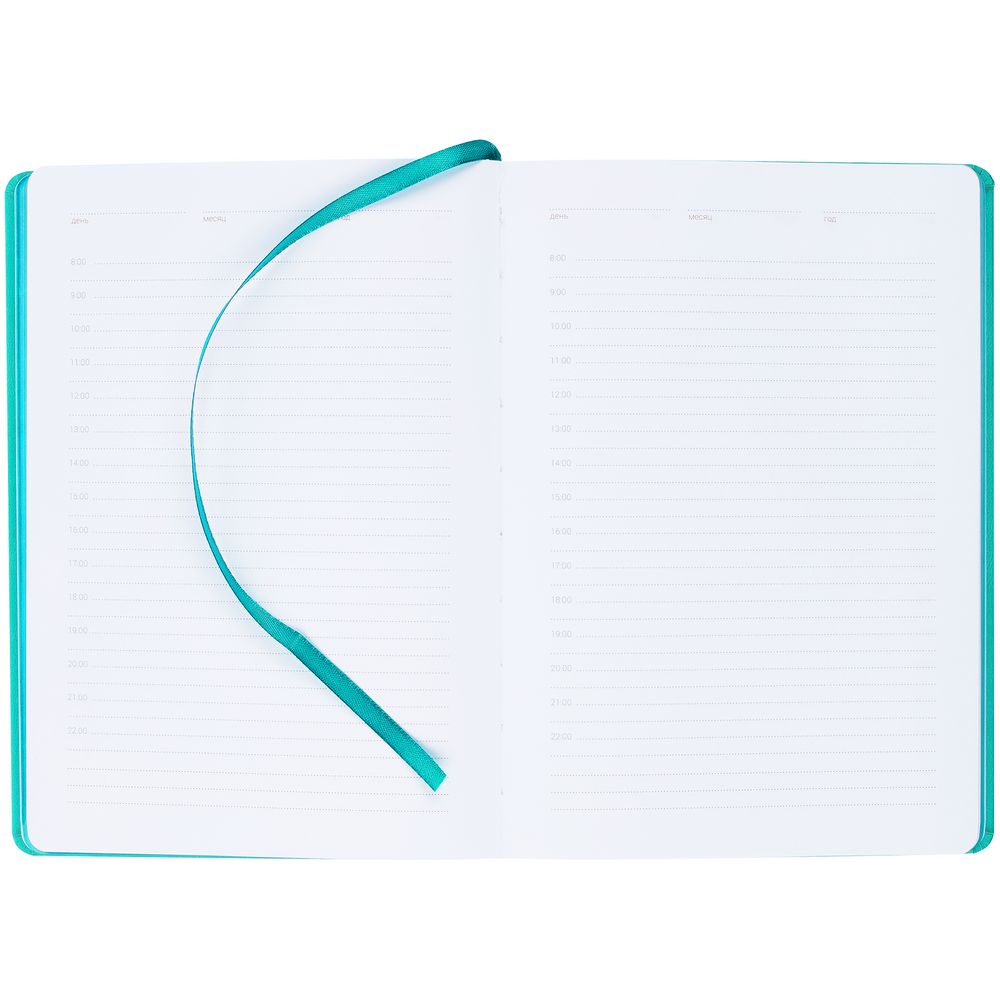 Ежедневник с твердой обложкой, выполнен из материала Latte, желтый КК, обрез зеленого цвета, дополнен ляссе желтого цвета и резинкой с металлическим шильдом.